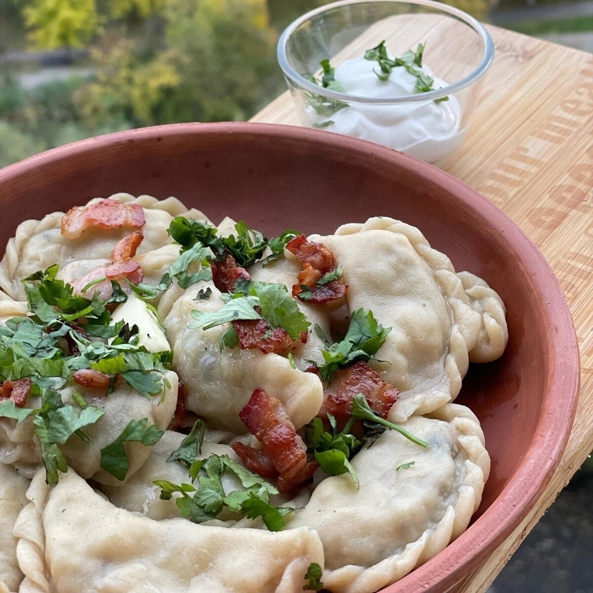 Вареники с картошкой и грибами Нам понадобится: Для теста: - вода 250 мл - яйца 2 шт - сметана 3 ст.л - соль - мука 500-600 гр Для начинки: - картофель 500-600 гр - грибы шампиньоны 250 гр - лук репка 1 шт - сливочное масло 40 гр - кинза 15 гр - соль/перец - растительное масло для обжарки Бекон сырокопчёный 100 гр ⠀ Ингредиенты для теста тщательно вымесить в миске около 5 минут. Завернуть в пищевую плёнку и убрать в холодильник на 30 минут. Картофель почистить и сварить. Из картофеля сделать пюре, добавить сливочное масло и посолить.Грибы и лук измельчить и обжарить на растительном масле до готовности. Посолить/поперчить. Смешать обжаренные грибы и картофель, добавить зелень. Из теста раскатать тонкий пласт, вырезать стаканом кружочки. На половинку кружочка положить начинку и прищипнуть края пальцами. Отварить в подсоленной кипящей воде 2-3 минуты, переложить в тарелку, добавить сливочное масло, обжаренный бекон и немножко зелени.