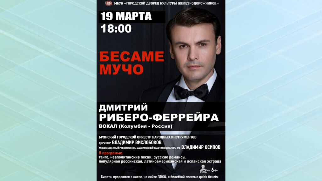 Чувственные и горячие латиноамериканские баллады, хиты итальянской эстрады и джазовые стандарты, песенные шедевры советской эпохи и самые проникновенные французские мелодии исполнит Дмитрий Риберо-Феррейра – участник популярной программы «Романтика романса» (телеканал «Россия-К»). Дмитрий Риберо-Феррейра – обладатель мягкого лирического бас-баритона. В его тембре голоса слились в пряный букет русская душевность и колумбийский огонь. На сцене Городского ДК Железнодорожников вместе с Дмитрием будет Брянский городской оркестр народных инстументов (художественный руководитель , заслуженный работник культуры РФ Владимир Осипов, дирижер Владимир Вислобоков), а также Good Sound Orchestra под руководством саксофониста Святослава Текучёва. Мероприятие состоится 19 марта. Начало в 18 часов. 6+ ФОТО: bgko.ru Дмитрий Риберо-Феррейра выступит с концертом в Брянске