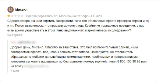 Не отвечаете на отзывы на Авито? – фатальная ошибка! Да, речь идет не только о положительных отзывах, но и отрицательных отзывах тоже! За чем нужно следить: — Дата, когда вы отвечаете — Как вы отвечаете Разберем сначала на примере положительных отзывов. Здесь достаточно просто отблагодарить человека, который оставил вам положительный отзыв и все! Но также очень важно. Ответьте человеку на отзыв в день, когда он его написал или хотя бы на следующий день. Авито отслеживает дату, когда вы ответили на отзыв. И люди, которые будут читать отзыв, и значительно воодушевит, что вы быстро отвечаете на отзывы Казалось бы мелочь, но это невероятно важно! А теперь перейдем к самым негативным клиентам, которым невозможно угодить! Удалить отзыв с Авито – это то еще мероприятие, где 90% решает просто удача. Но вы всегда можете развернуть ситуацию в свою сторону Ни в коем случае не реагируйте остро на негативный отзыв. Вы так оставите далеко не самое лучшее впечатление о себе. Если ошибка не с вашей ст