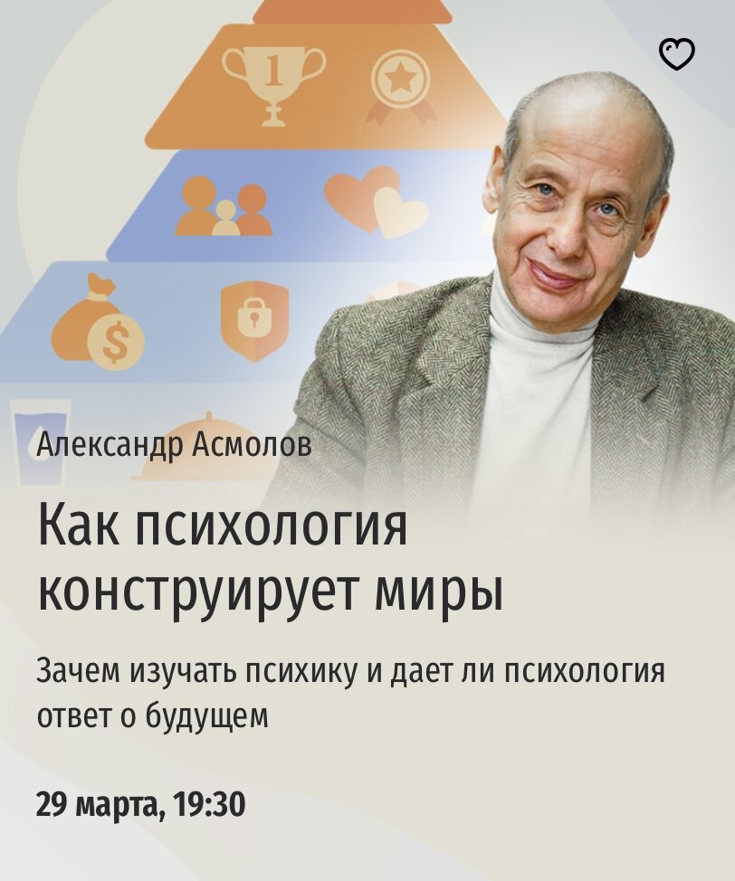 Психология личности стала очень популярной в последние годы, но все мы по-разному понимаем, что же скрывается под этим понятием. Коучи, психопрактики, тренеры, дизайнеры личности — сколько в их деятельности настоящего? Насколько далеки они от психологии как науки? Психолог — это скорее врачеватель души или ее исследователь? О том, что на самом деле изучает психология и какую помощь она оказывает человеку и обществу, поговорим с одним из ведущих экспертов — профессором Александром Асмоловым. — Что изучает психология и какова задача психолога? — Как психология изучает человека, с помощью каких методик, способов, техник? — Какие этапы становления прошла психологическая наука? — Почему в мире так сильно вырос интерес к личности и ее свободе? — Почему появилась возможность и большой запрос на психологическую помощь? Александр Асмолов «Как психология конструирует миры» 29 марта, среда, 19:30 Билеты