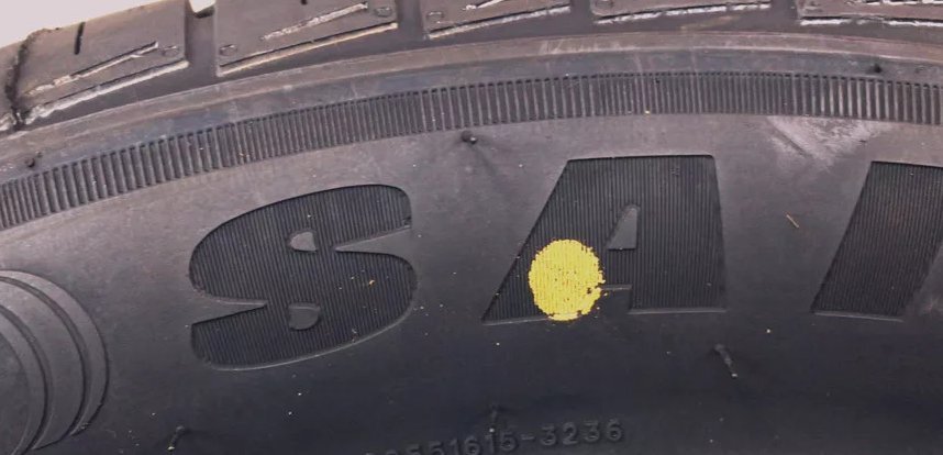 Новые шины имеют специальные желтые точки в определенных местах, называемые балансировочными метками. В этой точке отмечается самое яркое пятно на шине. Когда шина установлена на обод, эта метка совмещается с ниппелем, т.е. самым тяжелым местом на ободе.