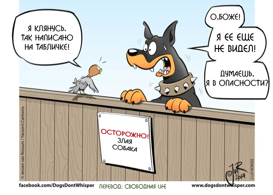 Поведение домашнего животного во многом зависит от того, как к нему относится хозяин. При правильном обращении, питомцы всегда будут добрыми, дружными и хорошо себя вести. Сегодня я собрала комиксы о жизни собак. Интересно, что автор этих иллюстраций много лет работал с животными, поэтому он знает о них все. На протяжении многих лет автор видел сотни собак с разным поведением, и помогал их владельцам наладить с животными контакт. Свои идеи он берет из жизни и фантазии. Цель художника - заставить людей улыбаться, а также показать необычный мир собак. Такая маленькая собачка и настолько самоуверенная! Это тот случай, когда герой слишком переоценил свои способности, а может быть он просто пошутил. Животные, как и люди, могут не сразу подружиться с новым членом семьи, особенно кошки. Хозяину придется немного постараться, чтобы его питомцы ладили между собой. Кошка всегда остается кошкой, поэтому увидев клубок ниток, она тут же бросилась к нему, забыв, что скрывается от собаки. Ну зато тепе