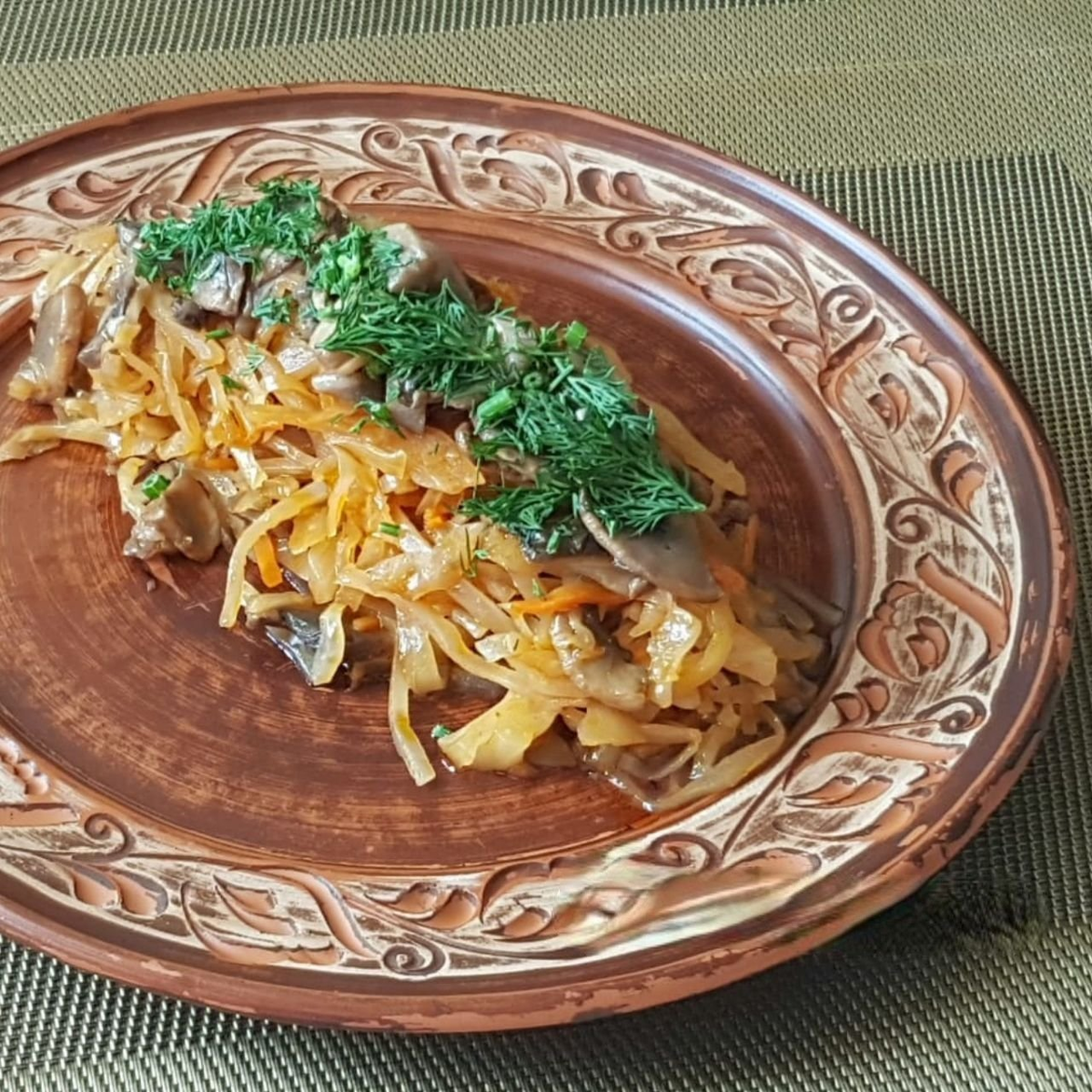Вот это блюдо как обычно из серии все знают, а я нет. Несколько лет назад моя подруга как раз во время Великого поста сказала мне, что делает тушеную капусту с грибами. Я хоть пост и не соблюдаю, но соблазнилась таким сочетанием. Сделала по ее совету и с тех пор готовлю так регулярно. Грибы содержат много белка, так что блюдо вполне сбалансированное. Хорошо бы лесных грибов припасти для такого случая, но за неимением их я тушу капусту с шампиньонами, получается тоже очень вкусно. Блюдо придется по вкусу всем, не только тем, кто соблюдает пост. Процесс приготовления: Лук (1/2 головки) и морковь (1 маленькую) режем соломкой. Пассеруем лук и морковь на хорошо разогретой сковороде, туда же добавляем нашинкованную соломкой белокочанную капусту (500 гр.). Если капуста жесткая, предварительно залейте ее кипятком минут на 10. Затем откиньте на сито. Огонь не убавляем (не забудьте в самом начале налить щедро растительного масла в сковороду), а когда капуста поджарится, добавляем столовую ложку