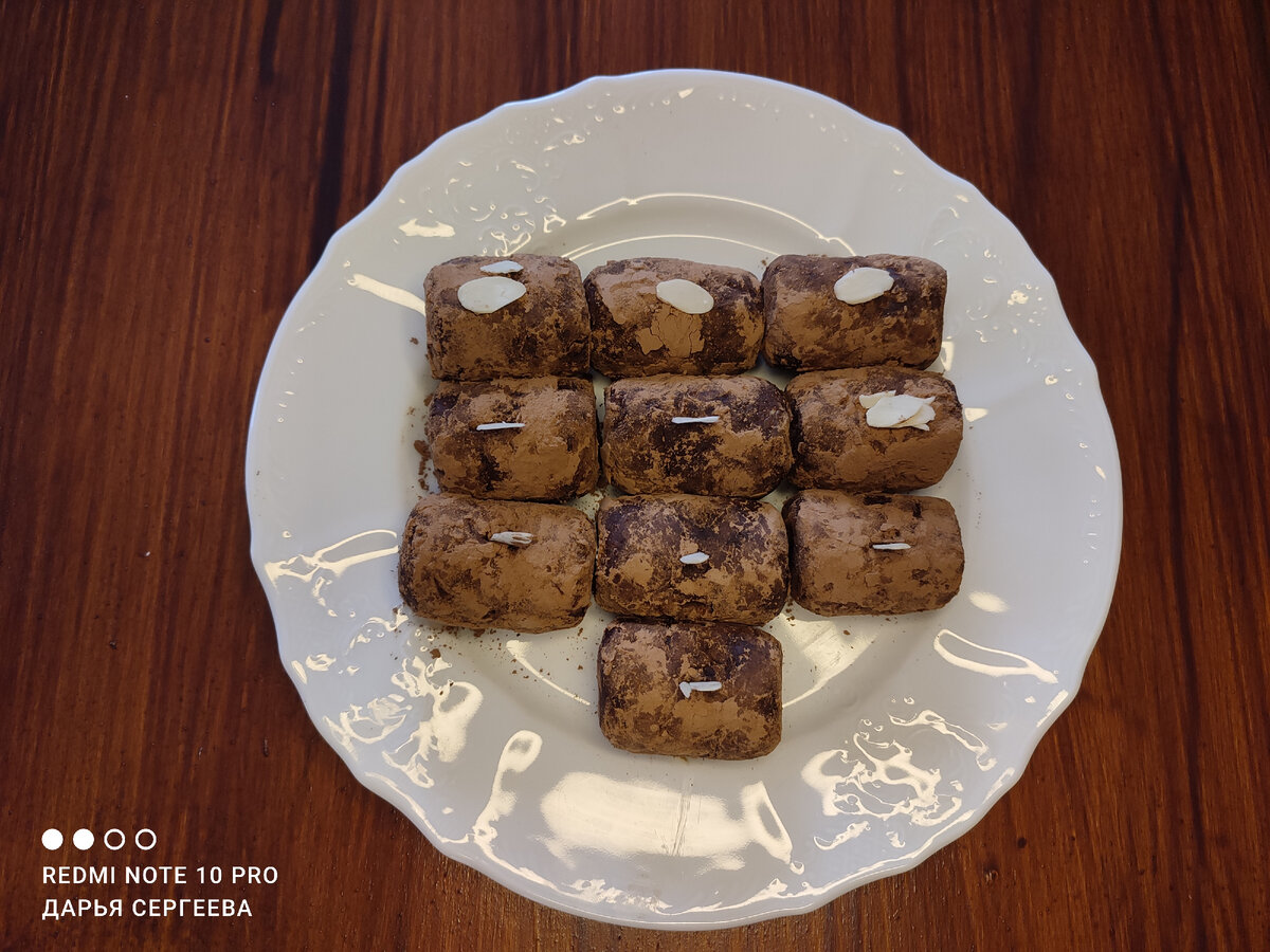 Каждую колбаску обваливаем в какао. Выкладываем на тарелку для подачи. На каждое пирожное кладем один миндальный лепесток, чтобы был цветовой контраст
