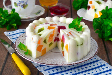 – Красивый, яркий, необычный, эффектный, на любой праздник! Торт Битое стекло со сметаной и желе готовится достаточно просто, а результат и на вид, и на вкус получается потрясающий. Это отличный десерт в любое время года. При желании его можно уложить на бисквитный или песочный корж! СОСТАВ/ИНГРЕДИЕНТЫ: Желе: - вода 600 мл. - желе 160 гр. Крем: - сметана 600 гр. - сахар 200 гр. - вода 180 мл. - желатин 25 гр. - ванилин 0.2 гр. ПОШАГОВОЕ ПРИГОТОВЛЕНИЕ: Время приготовления: 1 д. ШАГ 1: Как сделать торт Битое стекло со сметаной и желе? Для начала подготовьте необходимые ингредиенты по списку. Желе можете взять любых цветов и вкусов. У меня желе из апельсина, манго, киви и вишни. Сметану берите густую, от 20% жирности. Сахар можете заменить на любой подходящий сахарозаменитель. ШАГ 2: Порошок для приготовления желе распределите по 4 стаканам. При постоянном помешивании влейте в каждый по 150 мл кипятка. Тщательно перемешайте до полного растворения. ШАГ 3: Получившееся же