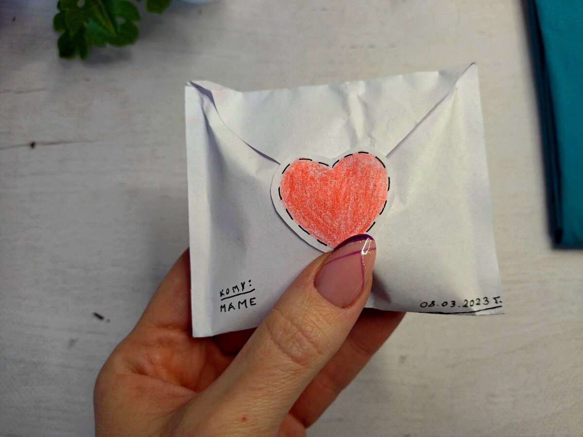 Дочка очень любит делать подарочки, причем с самого лилипуточного возраста. Такие небольшие презентики, совершенно милые и очень трепетные. На 8 Марта среди прочих приятностей я нашла и такой конвертик. Она каждую конфетку завернула в самодельный фантик и приклеила сердечки.