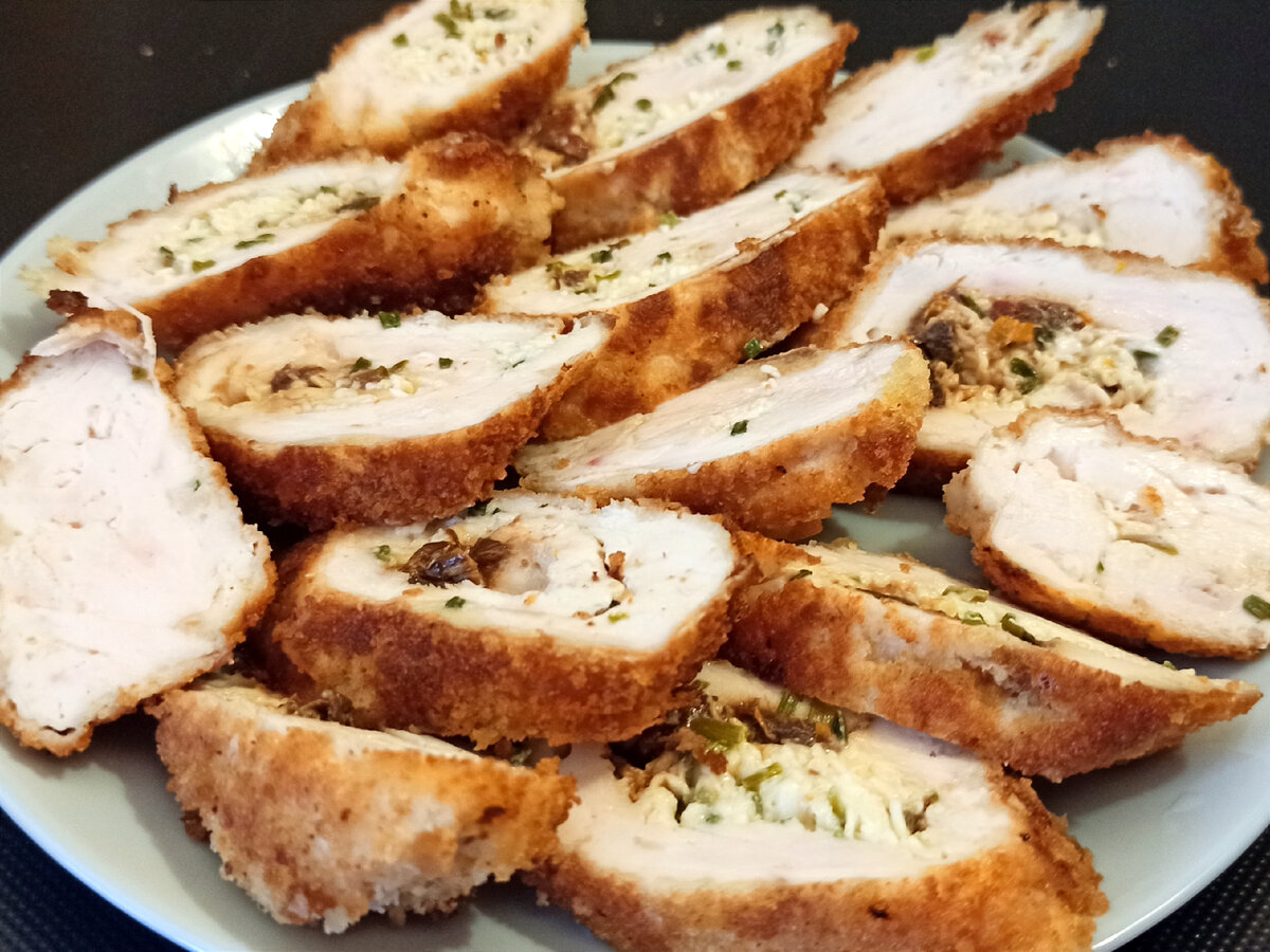 Куриные рулеты универсальное блюдо! Они будут вкусны горячими - сочная мякоть, чуть вытекающая начинка, хрустящая корочка. Хорошее горячее блюдо. Холодные рулеты, становяться другими - мясо чуть плотнее, начинка более ароматная, они прекрасно нарезаются, становясь хорошей закуской. Рецепт прост: Беру грудку без кожи, лучше её немного подморозить, чтобы лучше нарезалась на пластины. С одной гудки получается обычно 4 заготовки. Слегка отбиваю тыльной стороной, старая не рвать мясо. Начинка: сыр, зелень, немного вяленых томатов, майонез, соль перец. Подготавливаю панировку: Взбиваю яйцо В муку добавляю соль Беру готовые сухари или пробиваю блендером чуть подсохшую булку. Формирую рулетики. Панирую - мука, яйцо, сухари. Обжариваю на среднем огне с 4 сторон. Можно обжарить с 2 сторон и поставить в разогретую духовку на 5 минут. Рулеты из куриной грудки с начинкой готовы. Приятного аппетита!