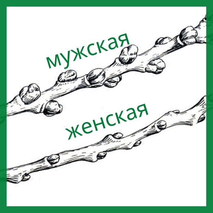 Рассматриваем побеги: на мужском почки крупные, имеют пять кроющих чешуй. Женские почки узкие, с двумя чешуйками.