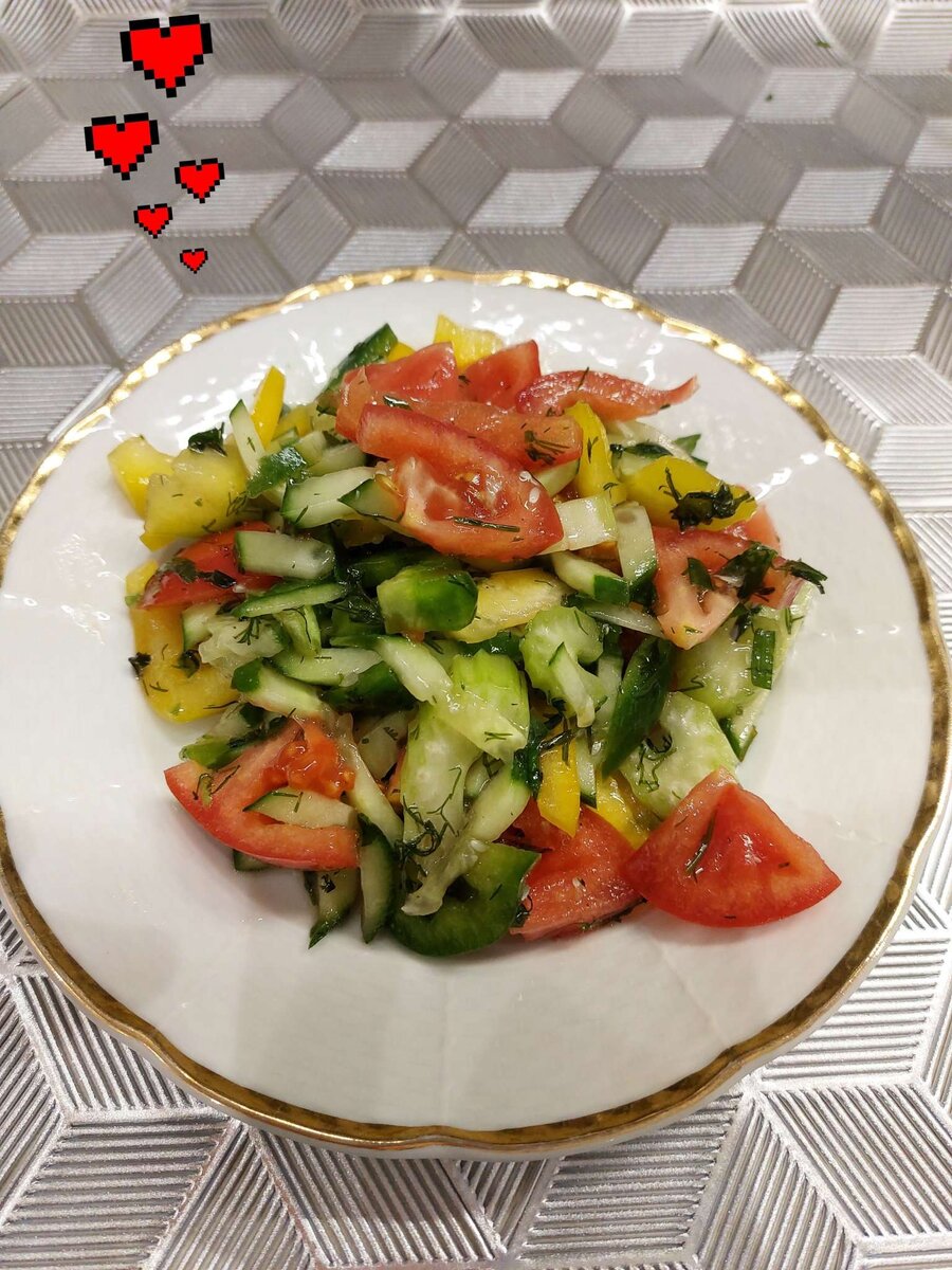 Сельдерей имеет много полезных свойств. Улучшает пищеварение, приводит в норму артериальное давление, сельдерей богат калием и витамином К, которые важны для здоровья сердца. Помогает снизить высокий уровень холестерина. Нам понадобится : Огурец 1 большой Помидор 2 шт. Перец болгарский 2 шт. Сельдерей 2 ст. Оливковое масло 1 ст.л. Зелень ( киндза, укроп, тархун) Нарезаем овощи, зелень. Соединяем. Добавляем оливковое масло, соль по вкусу. И наш полезный и вкусный салат готов! Приятного аппетита!