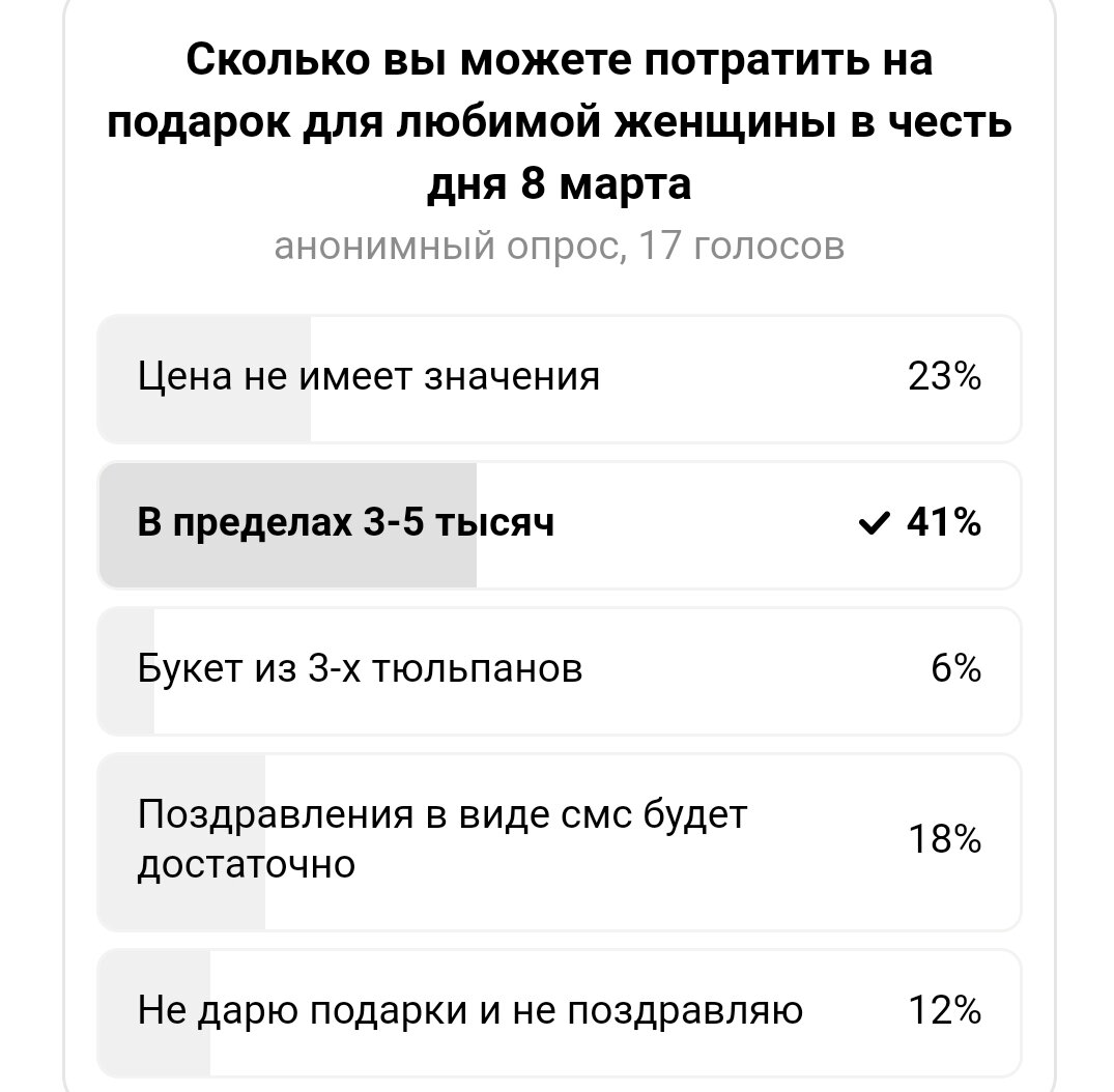 Ну ведь правильно же! Согласитесь! Подарок должен быть не обязаловкой на "отвали", я извиняюсь за такое выражение, а должен быть от чистого сердца, пусть даже в виде сообщения со смайликом. Может быть кто -то ждёт это сообщение и именно этот смайлик всю свою жизнь, а не букет из 101 розы, который подарен без любви. Как и обещала публикую результаты опроса " Какой ценовой категории должен быть подарок на 8 марта" К моему сожалению, опрос прошли всего навсего 17 человек из 60 прочитавших пост. Я хочу сказать огромное спасибо всем кто откликнулся, кто проголосовал и не проходит мимо мимо моих публикаций. Как видите, мнения разделились. Но всё же большинство проголосовало, что подарок должен быть ценовой категории от 3 до 5 тысяч рублей. Кстати, мой подарок на 8 марта, который подарили мне мои мужчины обошелся им стоимостью в пределах 2 тысячи рублей! Ведь главное не цена подарка, а внимание и чувство, с которым он подарен! Спасибо большое, что читаете! Всех с наступлением весны!