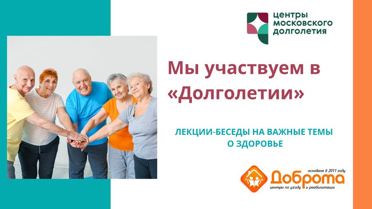 " Московское долголетие"- крупнейший оздоровительный, образовательный и досуговый проект для людей пожилого возраста. Среди направлений проекта: скандинавская ходьба, танцы, изучение языков, компьютерная грамотность, лекции по истории, искусству и ещё многое другое. По данным исследований Российской ассоциации геронтологов и гериатров, участники проекта " Долголетие" отличаются более высокими показателями здоровья, физической и когнитивной активности, меньшим уровнем депрессии. В проекте есть онлайн формат, можно заниматься не выходя из дома. Наши центры по уходу и реабилитации «Доброта» с нового, 2023года, с января месяца, начали активное сотрудничество с проектом «Долголетие». В рамках проекта провели: Заранее выбираются темы интересные большинству. В дальнейшем мы так же планируем интересные лекции. Следите за объявлениями. Цель совместного сотрудничества и наших лекций это рассказать о заболеваниях и дать рекомендации по профилактике. Чтобы если придется столкнуться с ними, люди
