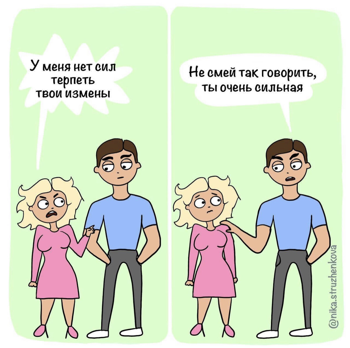 1) Ты меня доводишь! Ты меня спровоцировала! 2) С тобой нельзя по-другому обращаться! Ты не понимаешь по-хорошему! Ты не заслуживаешь лучшего. А ты заслужила подарок? 3) Ты неадекватная и сошла с ума. Тебе пора лечиться! 4) Хватит выносить мне мозг. Хватит меня пилить. Ну что ты начинаешь опять! Хватит меня долбать! (когда вы пытаетесь мягко поговорить об отношениях) 5) Твои подруги - глупые! Они плохо на тебя влияют, запрещаю с ними общаться. 6) Тотальный игнор и молчание в качестве наказания, если что-то идет не по его плану. 7) Ты все преувеличиваешь, ты драматизируешь. Я со всеми хорошо общаюсь кроме тебя, потому что ты больная. 8) Только попробуй...и увидишь, что будет! Ты об этом пожалеешь. 9) Если будешь хорошо себя вести, то тогда...⠀(небо в алмазах) 10) Из-за тебя мне плохо, ты измотала мне все нервы. 11) Я тебя воспитываю, любя. Если бы мне было все равно, я бы не делал тебе замечаний. Кто тебе правду скажет? 12) Кому ты нужна? Останешься одна! Скажи «спасибо», что я тебя