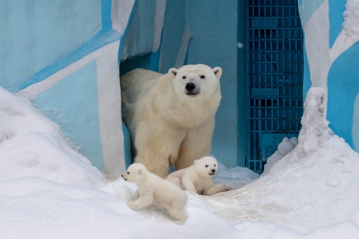 Белая медведица Герда впервые вывела на прогулку своих малышей