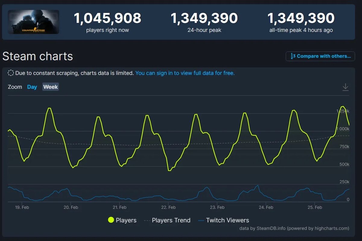 Вечером 25 февраля онлайн CS:GO в Steam достиг 1,349 млн человек, что является абсолютным рекордом за всё время существования шутера. Статистика доступна на сайте SteamDB. Это третий рекорд за месяц. Предыдущий был установлен 19 февраля, а до этого лучший результат был обновлён неделей ранее. До этих показателей максимальный онлайн CS:GO составлял 1,32 млн человек — этот рекорд держался с апреля 2020 года. Согласно данным SteamDB, на момент публикации материала CS:GO занимает третье место по пику игроков среди всех тайтлов в Steam. Шутер от Valve уступает только «королевской битве» PUBG: Battlegrounds и MMORPG Lost Ark.
