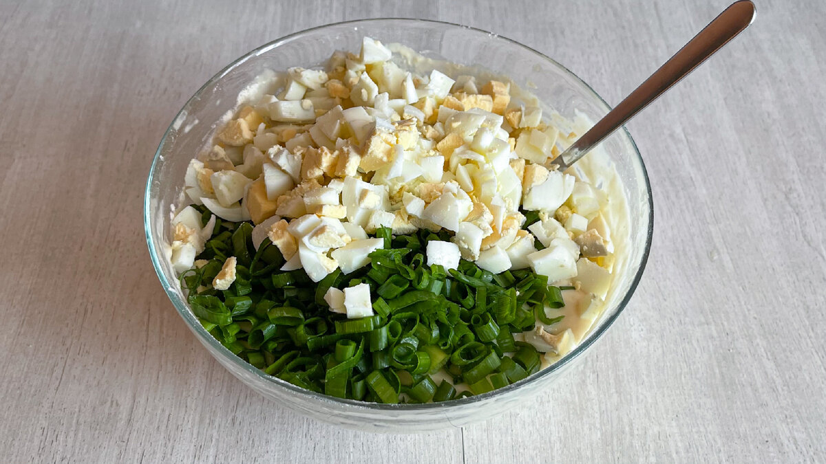 Пирожки – одно из любимых лакомств людей. Рецептов тысячи и каждый готовит так, как ему нравится. Некоторые на сковороде, некоторые в духовке. А есть те, кто ленится готовить пирожки, потому что это долго. Мой рецепт пригодится как раз таким людям. Начинаем готовить ленивые пирожки, которые станут вашим любимым лакомством. Для начала разбиваем в миску яйца и добавляем чайную ложку соли и столовую ложку сахара. Все тщательно перемешиваю венчиком. После этого добавляю кефир. Не перемешивая кефир, добавляю чайную ложку соды без горки. В кефире сода отлично гасится. Теперь можно начинать перемешивать. По мере смешивания, добавляю 2 столовых ложки растительного масла. Начинаю добавлять муку. Не нужно высыпать всё сразу. Мука сыпется постепенно, по мере перемешивания. Также это поможет следить за консистенцией. Тесто должно получится как на оладьи. Оно будет густоватым и работать с ним будет удобно. Начинаю приготовление начинки Беру 5 отваренных яиц и нарезаю их кубиками. Теперь нарезаю зел