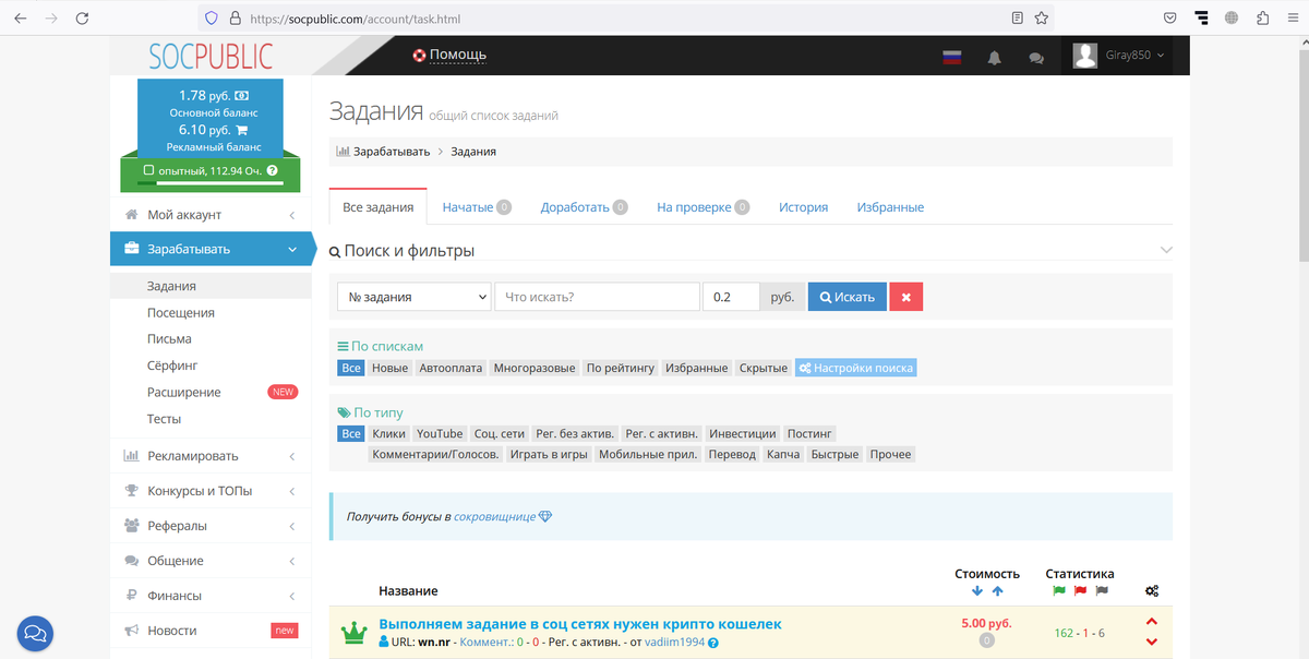 Всех приветствую, это первая публикация на этом канале и она будет посвещенна очень старому, но очень верному проекту. SocPublic (SP) - Это проект на котором вы сможете зарабатывать деньги выполняя простые задания/посещяя страницы/читая письма. Основной заработок приходиться на выполнение заданий. Минимальная цена за выполнения задания сосовляет 0,2 рубля (В основном это зажания по типу: поставить лайк, посмотреть видео) Помимо выполнения заданий, вы можеет их создавать для продвижения вашего сайта, привличения рефералов в проекты и тд. Так же в проекте присутствует система рейтинга. Чем больше рейтинг, тем больше вы можете заработать с рефералов, больше выводить денег и тд. Данную информацию вы можете прочитать и увидеть во вкладке Мой аккаунт --> Сводка --> Карьерная лестница. Очки (опыт) можно получать за выполнение достижений (Мой аккаунт --> Достижения) В первой вкладке вам будут показаны достижения которые вы выполнили (Полученные), а в следующуй будут показаны все достижения (