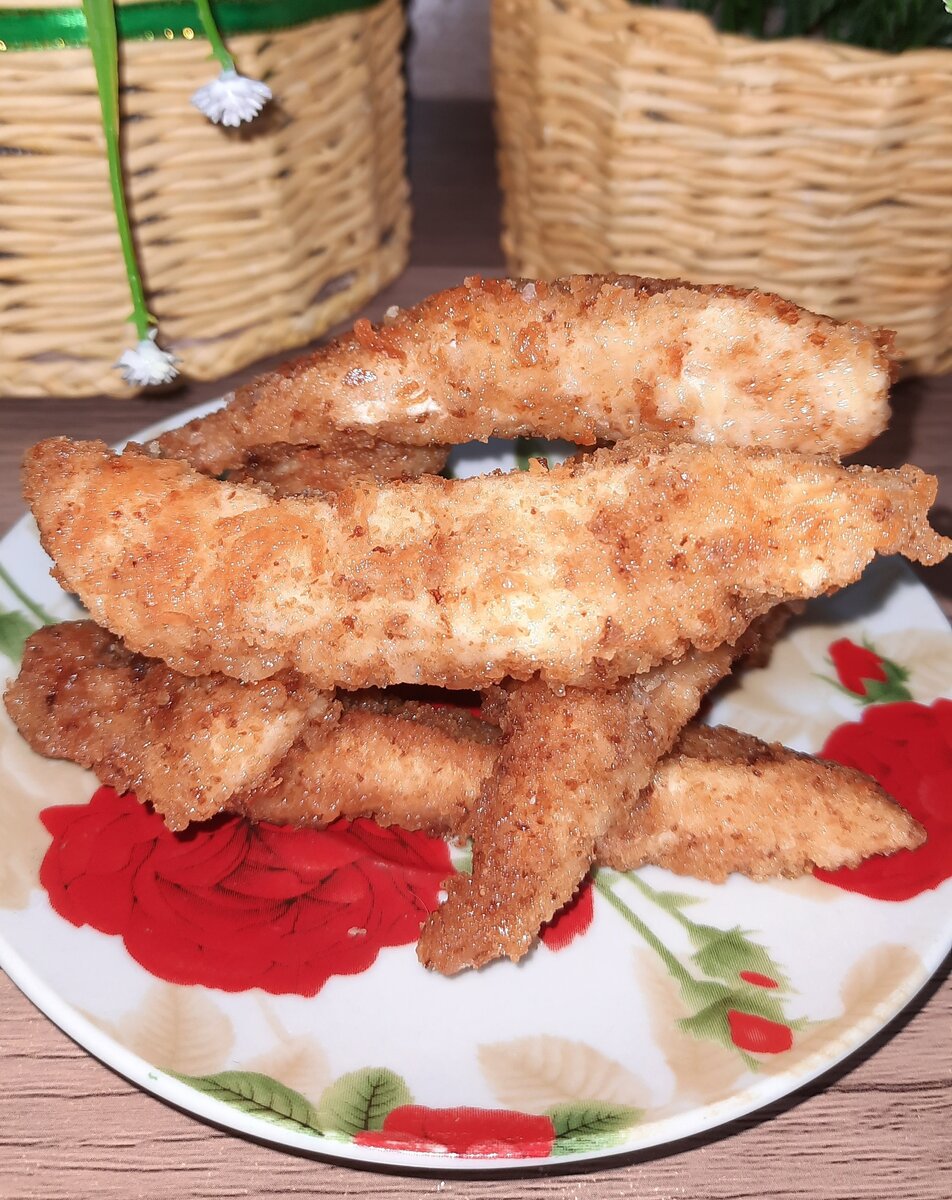 Очень простое блюдо. Готовится за несколько минут. Ингредиенты: Куринная грудка Мука Панировочные сухари Яйцо Тертый сыр Способ приготовления: 1. Куринную грудку режем полосками шириной примерно 1-1,5 см. 2. Смешиваем натертый на крупной терке сыр, панировочные сухари и муку 3. В другую посуду разбиваем яйцо 4. Опускаем полоску грудки сначала в яйцо, потом в смесь муки, сыра и сухарей 5. Обжариваем на раскаленной сковороде с обоих сторон по 2-3 мин. 6. Подсаливаем в сковороде