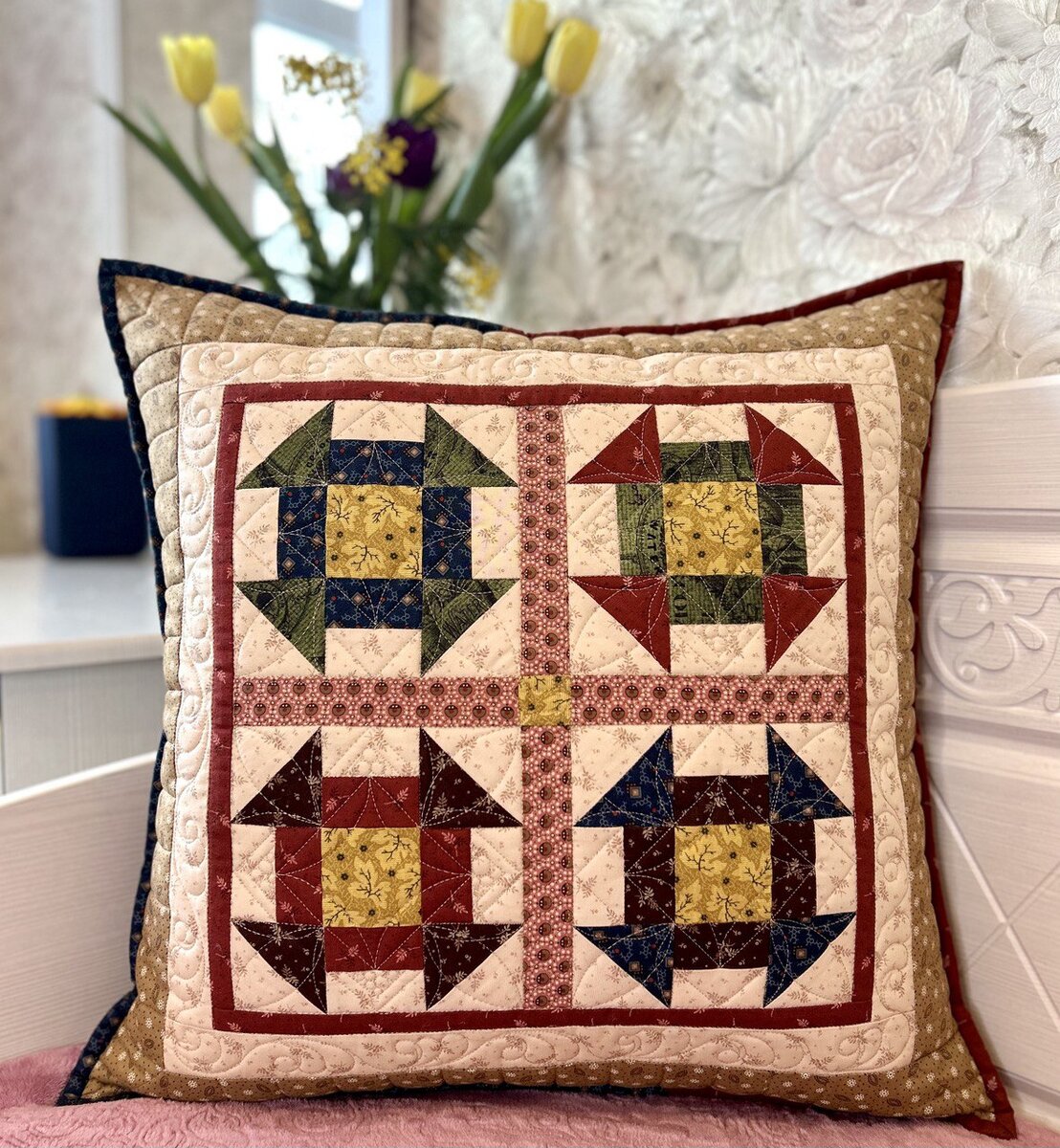 Для пошива моей подушки я использовала блок "Маслобойка" (с англ. Churn Dash) В его основе лежит скетка 3х3 (nine patch). Шьется этот блок очень легко и просто. Ниже на фото наглядно показала структуру блока Также можно не останавливаться на подушке и сшить хоть салфетку или дорожку, решать вам. я лишь всего могу показать некоторые варианты решений. Т.е. как вы понимаете цветовые варианты могут быть различными, так же и количество разделительных полос и бордюров. Прогуляйтесь по Pinterest, вдохновитесь идеями. Надеюсь, я вас вдохновила!
