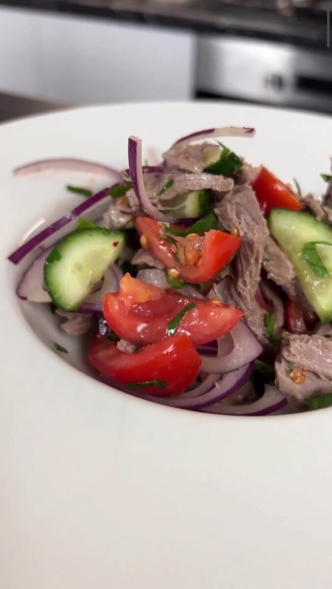 Сегодня покажу как готовить салаты, которые "разлетаются" первыми, они очень просты в приготовлении и самое важное они вкусные. Их я могу есть днём и ночью, каждых гостей угощаем ими и они конечно просят добавки) Самый вкусный в мире салат! Могу есть день и ночь 🤤 Ингредиенты: • Говядина 300 гр • Соль, лавровый лист, перец горошком • Огурец 1 шт • Помидоры 3-4 (мелкие) • Красный лук 1 шт • Петрушка или Кинза • Цедра лимона 1 ч.л • Сок лимона 1,5 ст.л • Красный острый перец на кончике ножа • Соль и черный перец по вкусу • Оливковое масло 2 ст.л Переходим к готовке: 1) Отвариваем говядину со специями час. 2) Готовое мясо разрезаем на мелкие волокна и нарезаем овощи: огурцы, помидоры, мелко нарезанную петрушку или кинзу. 3) Для заправки возьмём: цедру и сок лимона, красный острый перец, соль, черный перец и растительное масло. 4) Перемешиваем салат с заправкой и даём постоять 10 минут. 5) Влюбляемся в салат ;) Овощной салат с говядиной 😋 Ингредиенты: • Говядина - 250 гр