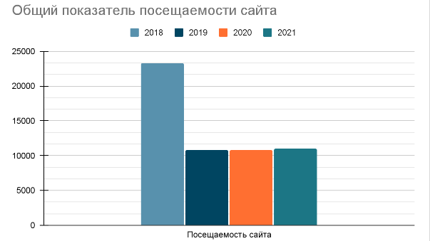 Как вы можете увидеть выше в диаграмме “Общий показатель посещаемости сайта” данные за 2018 год - это результаты сотрудничества с другим агентством. А период 2019-2021 время работы нашего агентства.