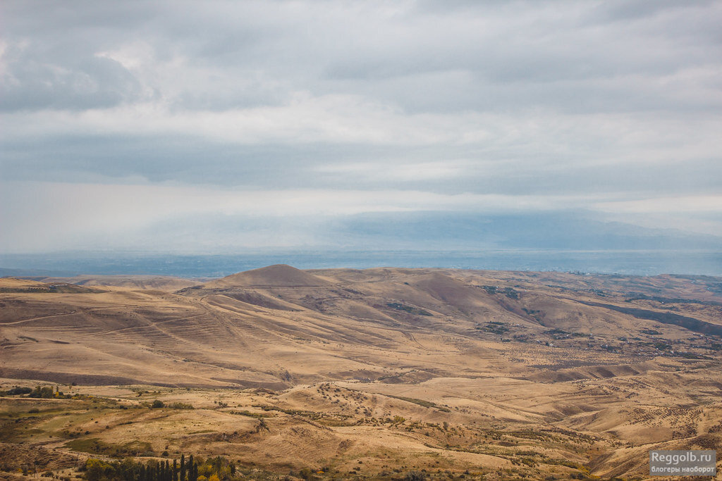 Сравнив стоимость экскурсий и аренды машины (а также почитав про состояние дорог), мы решили чуть ли не первый раз в жизни отправиться смотреть достопримечательности с организованным туром. Как ни странно, мы об этом совсем не пожалели. Первым пунктом нашего посещения была арка Чаренца, откуда по задумке должен был открыться шикарный вид на Арарат. К сожалению, нам достался вид только на затянутую облаками долину: Сама арка была построена в 1957 году архитектором Рафаэлем Исраэляном, который, проезжая мимо, заметил, какой красивый вид на Арарат открывается с этого места, и решил создать обзорную площадку. А на арке выгравированы слова стихотворений известного армянского поэта Егише Чаренцу, в честь которого и назвали арку. Далее нас повезли в монастырь Гегард, который считается одной из наиболее популярных достопримечательностей в Армении. На этом месте первый монастырь был основан Григором Просветителем еще в IV веке, но его постройки не сохранились, пострадав от пожаров, землетрясени