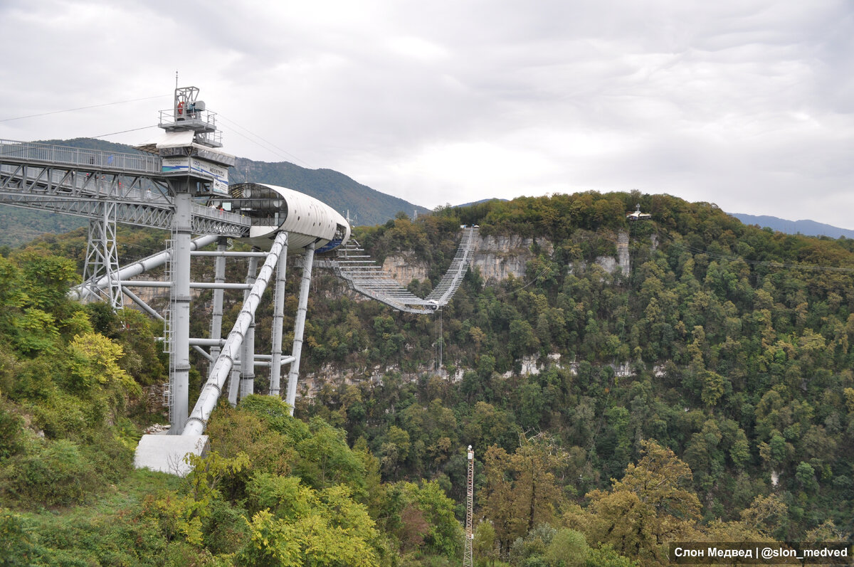 После покупки входного билета, который мы приобрели онлайн, примерно за 2000 рублей с человека, нам открывается доступ к самому парку. Чтобы ступить на сам подвесной мост (тут его называют скайбридж), надо пройти мимо симпатичного ресторана с панорамным видом на ущелье.