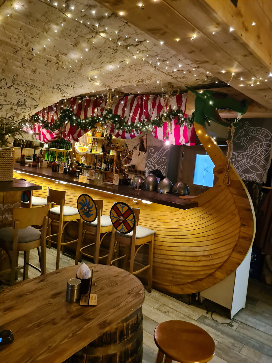 Решили мы захватить стол в этом баре. Да-да именно захватить, причем совершить захват стола нам предложила сама сотрудница заведения, когда я им позвонила, чтоб заказать столик. Обсудили время захвата, количество персон, и мне буквально сразу после разговора пришло смс-уведомление, что нашу дружину ))) из двух человек ожидают в воскресенье. Из заголовка ясно, что бар по совместительству еще и музей поэтому создавать атмосферу начинают уже при заказе стола. Приехали мы в заведение. Что же нас ждет? Встретил нас гостеприимный и радушный персонал, а также интерьер эпохи викингов. Было такое ощущение, что мы спустились в пещеру с антуражем средневековой скандинавии. В первом зале, а всего их два, барная стойка в виде скандинавского корабля - драккара, с драконом на носу судна. Вся мебель массивная из дерева, на стенах шкуры животных, рога оленей, щиты, оружие викингов. Для гостей есть различная атрибутика тех времен, можно примерить шлем, либо полностью войти в образ и сфотографироватьс