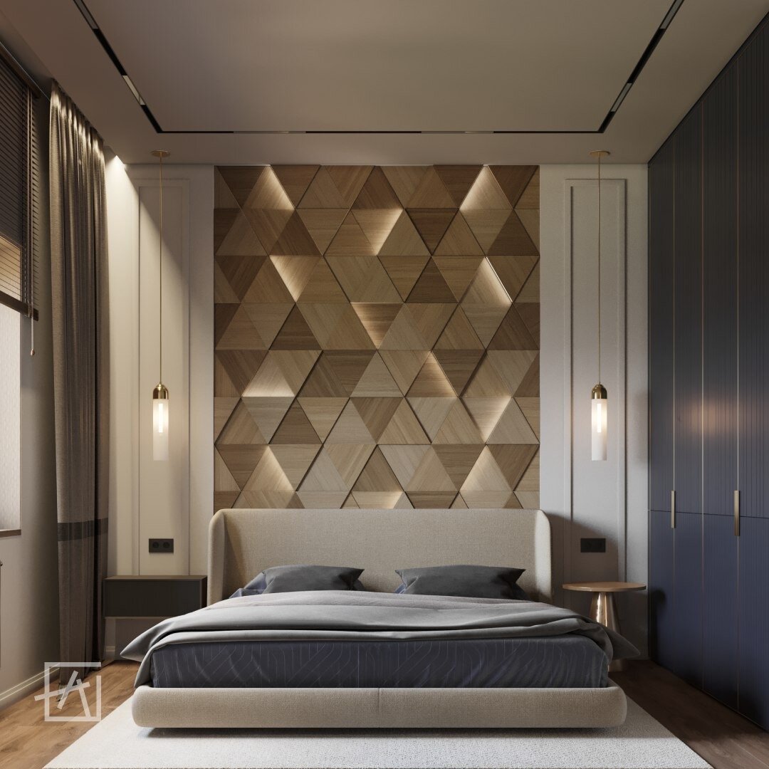 Спокойный, яркий, уверенный — первое, что приходит в голову, смотря на этот интерьер. Цепляющий взгляд акцент спальной зоны — объемное панно из массива со светодиодными вставками, которое можно использовать как один из сценариев приглушенного освещения. Асимметрия в прикроватных тумбах добавляет строгому интерьеру свежести и живости! Для того, чтобы гармонично сочетать спальню с интерьером всего дома, добавлены золотые элементы: окрашенные радиаторы, светильники, фурнитура. Идеальный минимализм не приветствует лишнего шума. В каждом проекте мы тщательно прорабатываем размещение кабель каналов, что позволяет избавиться от торчащих проводов в ТВ-зоне. Интересная деталь этого интерьера в потолке, он — тонированный и окрашен на пару тонов темнее стен. Такой прием сейчас в тренде и смотрится оригинально и стильно. Мы любим прорабатывать интерьер до мелочей: даже тон постельного белья подобран здесь не случайно. Как вам эта спальня? Оцените ее от 1 до 10 в комментариях 👇🏻 #Выходец_
