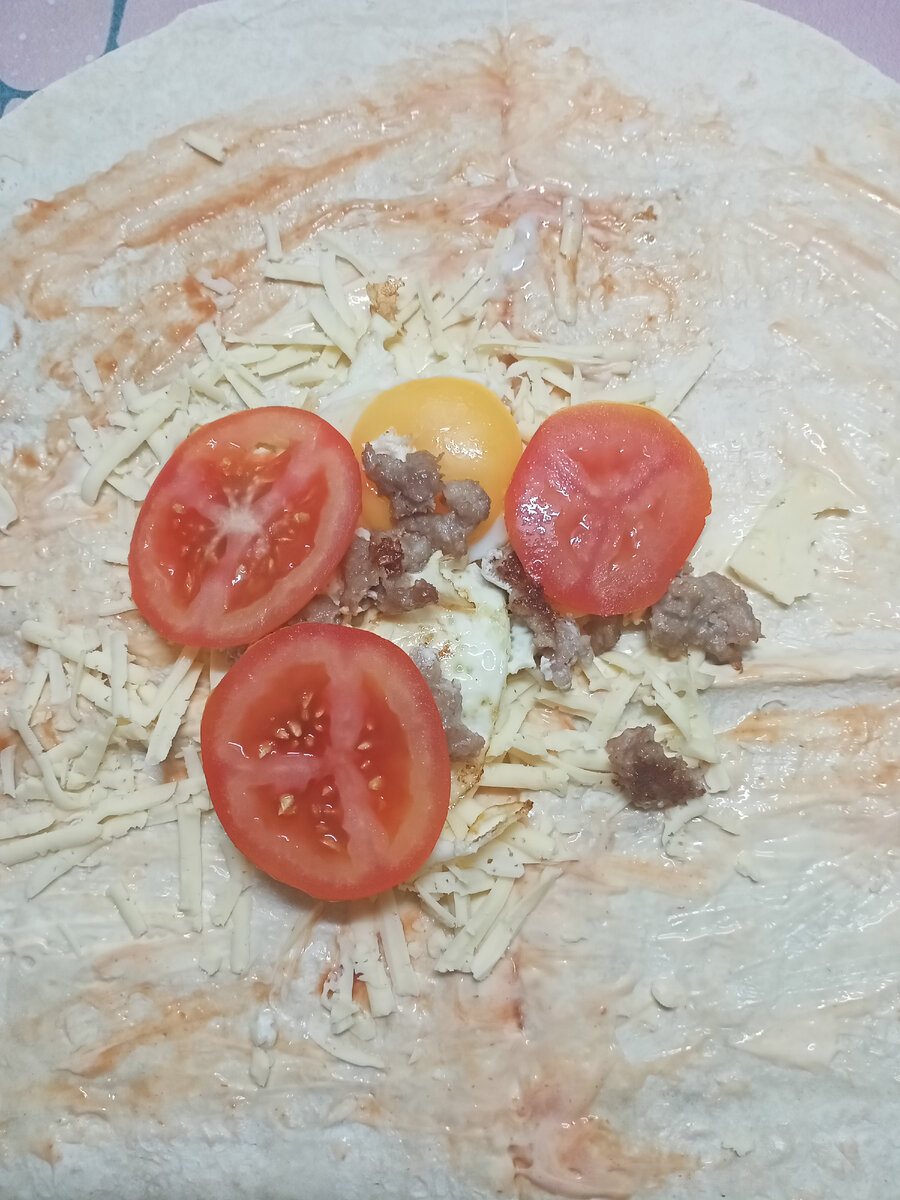 Сделала из того, что было в холодильнике. Вообще люблю смазывать полоски лаваша сметаной, посыпать сыром и обжаривать на сковороде. Сыр внутри тает, получается очень вкусно! Решила дополнить. На сковороде обжарила остатки фарша и добавила два яйца. Довела до готовности. Большой лист лаваша разрезала пополам. Смазала смесью из кетчупа и майонеза. Посыпала тёртым сыром (Тильзитер), сверху положила одно готовое яйцо и половину фарша. Накрыла помидорками. У меня оставался ещё плавленый сыр. Сверху положила его. Но можно просто посыпать обычным сыром. Потом всё завернула в конверт и положила на ту же сковороду, где обжаривала фарш. Подогрела до румяности с обеих сторон. Получилось нежно, вкусно и тепло. Я бы ещё добавила или лук репчатый, или зелень. Приятного аппетита!