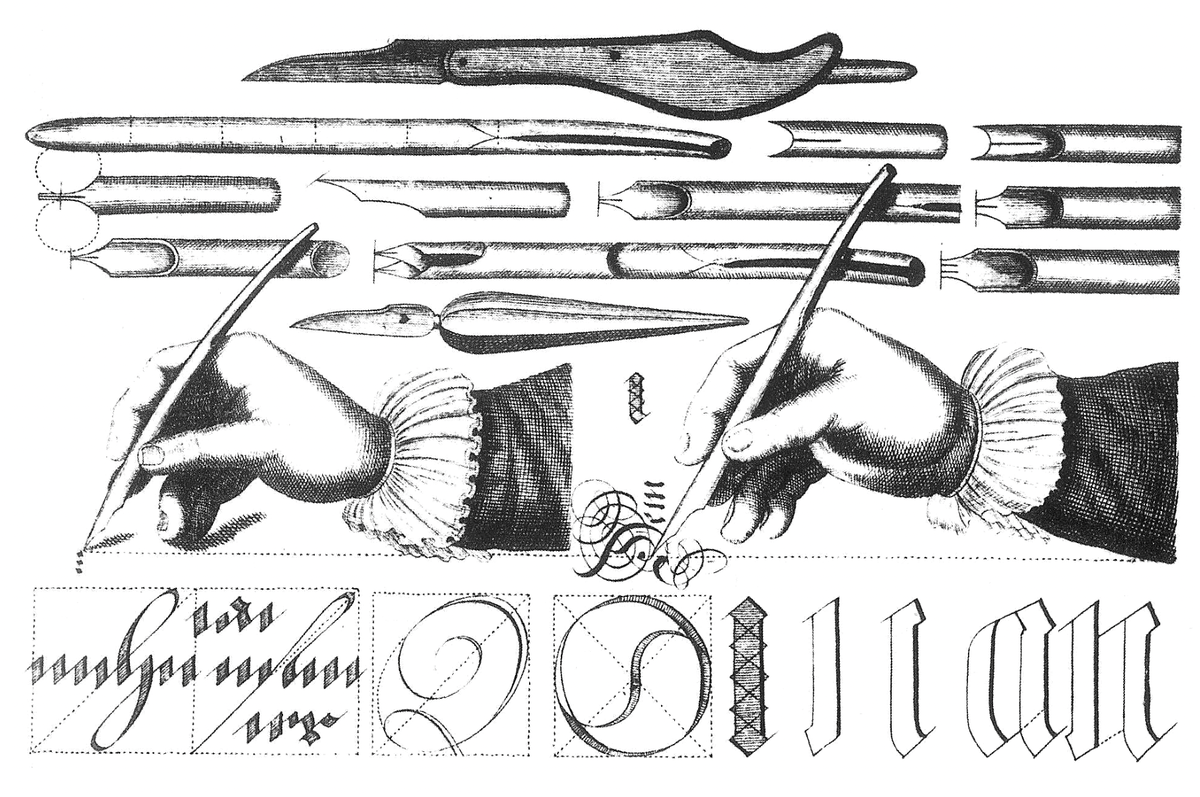 По жесткости линии Калям ближе к металлическому ширококонечному перу, чем к птичьему. Мел и уголь — одни из самых ранних инструментов, задававших форму знаков. Процесс письма дробился на серии мелких тычков. Птичье перо — очень мягкий, пластичный инструмент. Кончик пера делался широким и срезался под углом, далее перо закаливалось в горячем песке, что давало регулярный вертикальный или наклонный штрих с тонкими переходами. Характерным артефактом перьевого письма является клякса. Стилос — инструмент для письма по восковой дощечке в вид