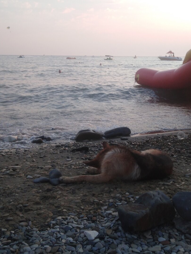 На пляже шум и гам, смеются и плачут дети, продавцы кукурузы громкими голосами рекламируют свой товар, афроамериканцы без комплексов-приглашают на фото с ними, поднимают на руки женщин и те смеются от страха и радости) Тут весело и шумно... Вечереет... И вдруг среди этой суеты появляется большая собака.... Это овчарка с печальным глазами. Она подходит и ложится на мокрый песок у самого края воды, оглядывается и кладёт свою голову на лапу... И замирает, закрыв глаза. Кажется, она о чем-то думает, изредка вздрагивая, когда край волны задевает её задние лапы. Окружающим людям не до неё, тут каждый занят своим делом. Лишь изредка проходящие люди, чаще дети, отвлекаются от поедания сладкой ваты и участливо смотрят на собаку. Кто-то налил ей питьевой воды в стакан, но она даже не притронулась... Вздохнула и опять прикрыла глаза. "О чем ты грустишь, собака?" Хочется мне спросить у неё. Может, тебя бросил хозяин, и тебе совсем не хочется жить, есть и пить, и поэтому ты пришла сюда к людям, что