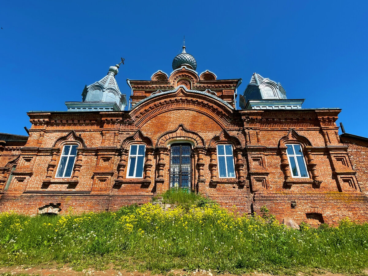 Чем дальше продвигались на север, тем больше удивляли места. Местами бездорожье, лужи, хотя начало лета, заросли борщевика, в селах мощная техника. Вот и Тужинский район, по пути село Ныр в которое мы заехали не случайно. Нас интересовал храм, красивый храм построенный из красного кирпича в стиле эклектики. Церковь Иоанна Златоуста больше похожа на замок посреди пустыря, нежели на храм. Стоящая обособливо и в то же время рядом с домами. Строительство храма началось в начале XX века. Сохранилось даже старое фото, как здание выглядело до того, пока к нему не пристроили придел. Святыню построили в честь Св. Иоанна Златоуста. Архитектором выступил И. А. Чарушин. Деньги на строительство храма были выделены вятским купцом Федором Рощиным.
