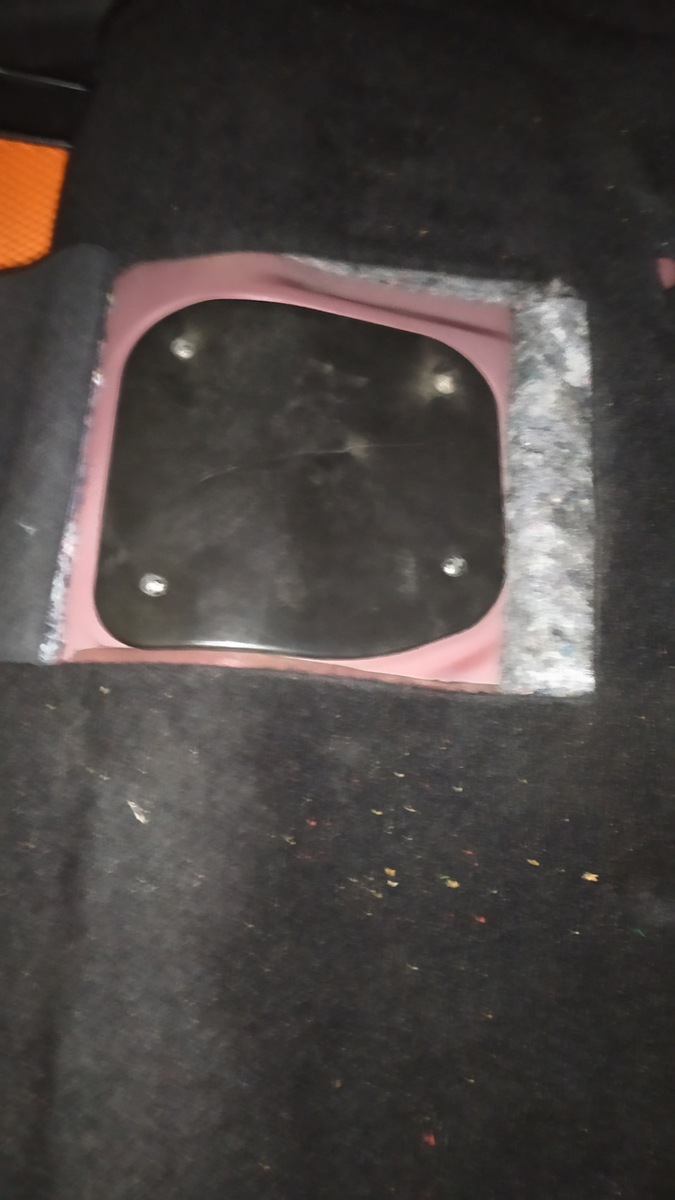 Доступ ко всему этому добру есть из под нижней подушки заднего дивана. В ковролине прорезано окошечко под которым виднеется пластиковая крышка на 4х винтах