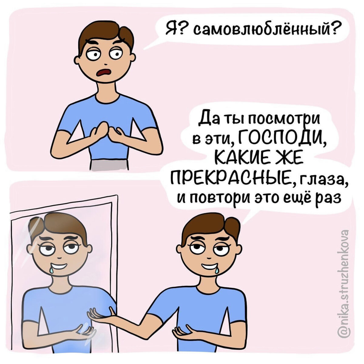 Итак, нарцисс… Пишу в мужском роде, но напомню, что нарциссом может быть и женщина, конечно. 1) Не эмпатичен и не разделяет искренне ваши переживания. 2) Не умеет строить отношения экологично, потому что после стадии идеализации у него наступает стадия обесценивания партнера. 3) Считает себя особенным и право имеющим на все. 4) Его исправление и осознание- это заход на второй круг, когда он решает «отработать» старый нарциссический ресурс по новой. 5) Он даёт о себе знать(пингует), чтобы сохранить связующие «ниточки», подпитаться и при необходимости прийти к старой «кормушке». 6) Он использует неглект- убийственное пренебрежение вашими потребностями. 7) Он использует висхолдинг, то есть отшучивается, переводит стрелки и нападает, если вы хотите разобраться, что вообще происходит. 8)Он мастер спорта по газлайтингу, то есть переворачивает все факты в свою пользу, выставляет вас сумасшедшей/психованной/ неадекватной. 9) Использует триангуляцию, то есть вовлекает в ваши отношения третьи
