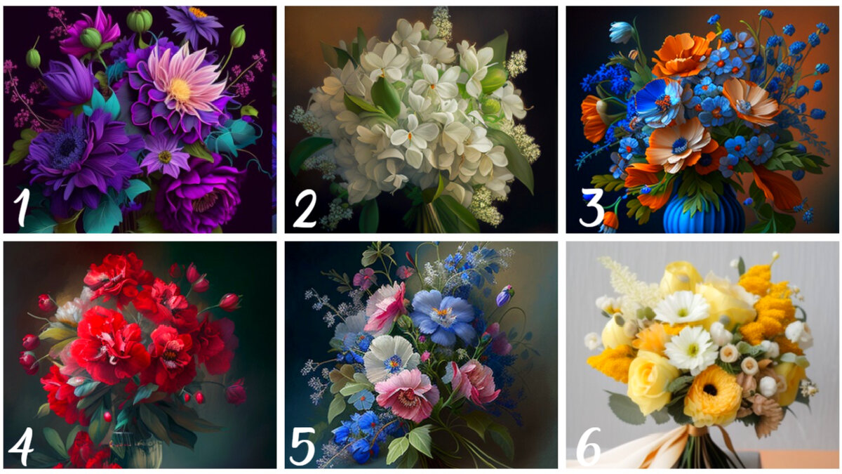 Добро пожаловать на наш тест в один клик! Всего за несколько минут вы можете узнать, что отличает вас от всех остальных, просто выбрав букет. Этот тест быстрый, веселый и легкий, и результаты могут вас удивить! Так что выбирайте букет, и давайте начнем раскрывать ваши уникальные качества. Выбирайте сердцем, не включайте логику, делайте выбор быстро, тогда результат буде более точным! Мне важно знать, какой букет выберите вы и совпадет ли результат с тем, что есть на самом деле, поэтому очень жду ваших комментариев с отзывами! Букет №1 Если вы выбрали этот букет, то возможно вам нужен перерыв, покой и возможность восстановить свои силы. Вас отличает от других ваша высокая амбициозность. Вероятно, что ваши трудолюбие и настойчивость уже привели к переутомлению, поэтому ваш организм нуждается в помощи. Букет №2 Букет представляет собой привлекательный, воздушный и свободный образ, который может показаться идеальным целевым ориентиром в бесконечной гонке за успехом. Однако, стоит заду
