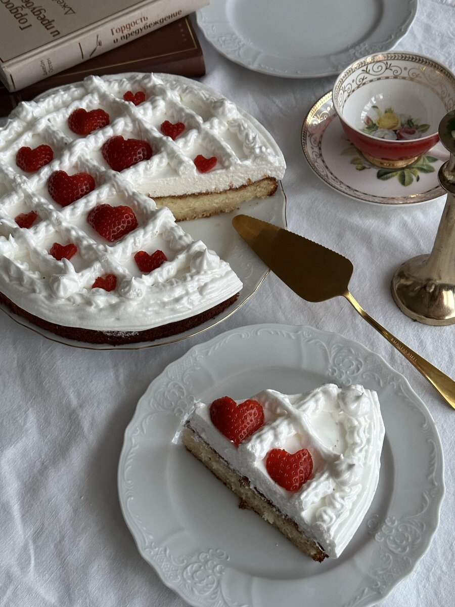 Этот десерт готовится очень просто и довольно быстро. В целом сам корж уже настолько мягкий и воздушный, что даже не нуждается в дополнениях. Но в таком сочетании он точно не оставит никого равнодушным. Я дополнила десерт клубникой, но вы можете отталкиваться от своих предпочтении. Приступим! Бисквит Яйцо- 3 шт Сахар- 200 гр Молоко- 200 мл Растительное масло- 3 ст л Мука- 200 гр Разрыхлитель- 10 гр Ванильный сахар- 10 гр Яйца с сахаром взбиваем до пышной пены. Добавляем молоко, масло и цедру. Сухие ингредиенты просеять через сито, смешать. Смешиваем две смеси, взбиваем миксером. Добавляем клюкву обваленную в муке. Форму смазываем маслом, присыпаем мукой и в духовку на 180 гр, на 30-35 минут. Крем: Белок 200 гр ( ~ от 6 яиц) Сахар 300 гр Ванилин В сухой и нежирной миске взбиваем до легкой пены белок с щепоткой соли. В 3-4 захода вводим сахар и ванилин. Взбиваем на максимальной скорости до крепких пик. Украшаем бисквит кремом. Можно выложить рисунок с помощью конд