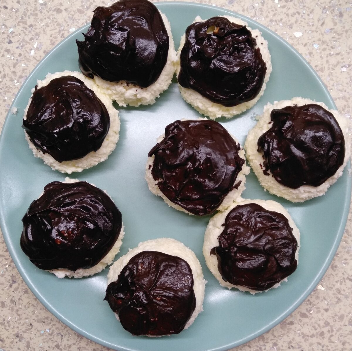 Достаю творожно-сливочные шарики из морозилки и поливаю их полученной шоколадной глазурью.
