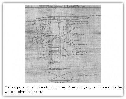 Одна из таких схем была переправлена в управление внутренних дел облисполкома города Магадана. На схеме было указано — "Хиниканзия, севернее 300 км от Охотска", которая была опубликована тенькинским журналистом А. Семененко в районной газете "Ленинское знамя" (Усть-Омчуг).