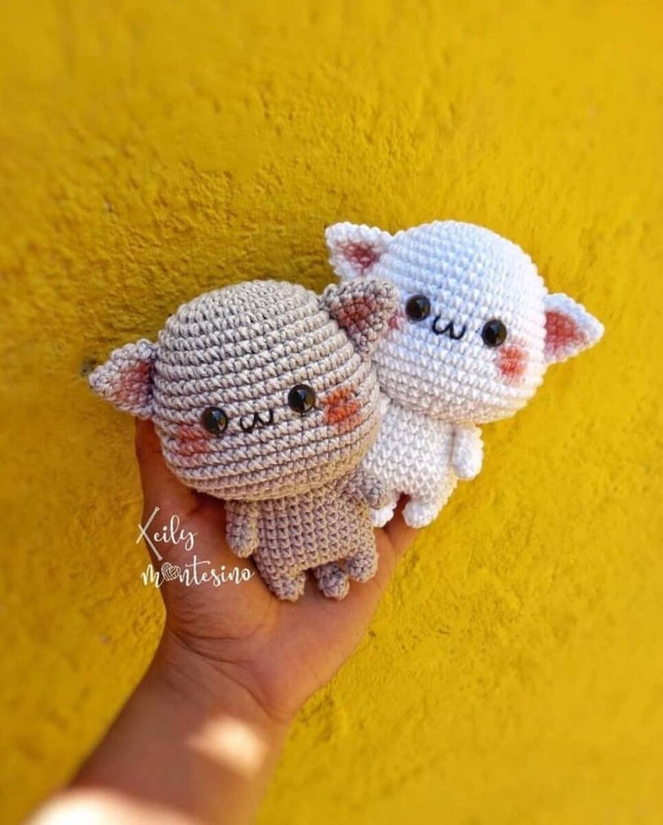 Голова Набивать в процессе вязания 1р. 6сбн в КА 2р. 6пр - 12 3р. (сбн, пр)*6 - 18 4р. (2сбн, пр)*6 - 24 5р. (3сбн, пр)*6 - 30 6р. (4сбн, пр)*6 - 36 7р. 36сбн 8р. (5сбн, пр)*6 - 42 9р. (6сбн, пр)*6 - 48 10-14р 48сбн 15р. за переднюю петлю 16сбн, 3пр, 10сбн, 3пр, 16сбн - 54 16-18р. 54сбн Вставляем глазки между 13 и 14 рядами, расстояние 4сбн. 19р. 16сбн, 3уб, 10сбн, 3уб, 16сбн - 48 20р. (6сбн, уб)*6 - 42 21р. (5сбн, уб)*6 - 36 22р. (4сбн, уб)*6 - 30 23р. (3сбн, уб)*6 - 24 24р. (2сбн, уб)*6 - 18 25р. (сбн, уб)*6 - 12 26р. 6уб - 6 Кольцо стянуть, нить затянуть, спритать. Ноги 2 детали 1р. 6сбн в КА 2-3р. 6сбн Со второй ножки начинаем вязать тело Тело Набираем 6вп и присоединяем к первой ножки 1р. 6сбн по 1-й ножки, 6сбн по цепочке, 6сбн по 2-й ножки, 6сбн по цепочке - 24 2р. 3сбн, пр, 11сбн, пр, 8сбн - 26 3-13р. 26сбн Нить затянуть, оставить длинный конец для пришивания. Уши 2 детали 1р. 4сбн в КА 2р. 4сбн 3р. 4пр - 8 4р. (сбн, пр)*4 - 12 5-6р. 12сбн Оставить длинный конец для пришивания.