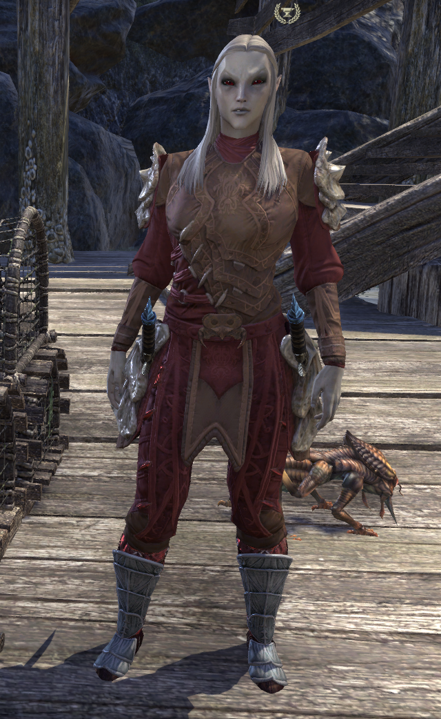Многие, играя в The Elder Scrolls Online, восхищаются персонажем Нарью Вириан. Впервые Нарью появляется в сюжете локации Дешаан. Позже создатели игры возвращают ее в новой главе Морровинд. Сюжетный квест города Балмора повествует о трагедии ученицы Нарью, о которой сейчас эта статья. Вейя Релет, по моему мнению, самая миловидная представительница данмерской расы. После того как я прошла квест, я была решительно настроена на воссоздание ее внешности на своем игровом персонаже. И вот, что у меня получилось. А вот сама Вейя По-моему вышло достаточно похоже. Ниже представлены настройки внешности Прическа "Ниспадающие локоны" раздавалась как награда за ежедневный вход в игру в октябре 2022 года, возможно позже появится в кронном магазине. Костюм составлен из стилей Мораг Тонг(куртка, поножи, плечи, пояс) и сапоги стиля дома Редоран.