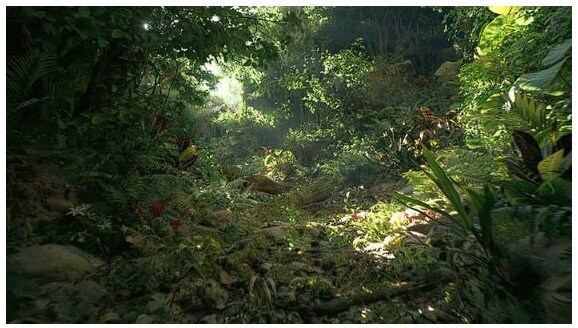 Демонстрация начинается со сцены густой листвы освещенной солнцем. Природную среду труднее всего визуализировать, поэтому Epic демонстрирует ее здесь. Система виртуальной геометрии Nanite в Unreal Engine изначально не работала с листвой, но обновления после ее запуска улучшили эту возможность до такой степени, что растения могут деформироваться и двигаться в ответ на воздействие в игровом мире.