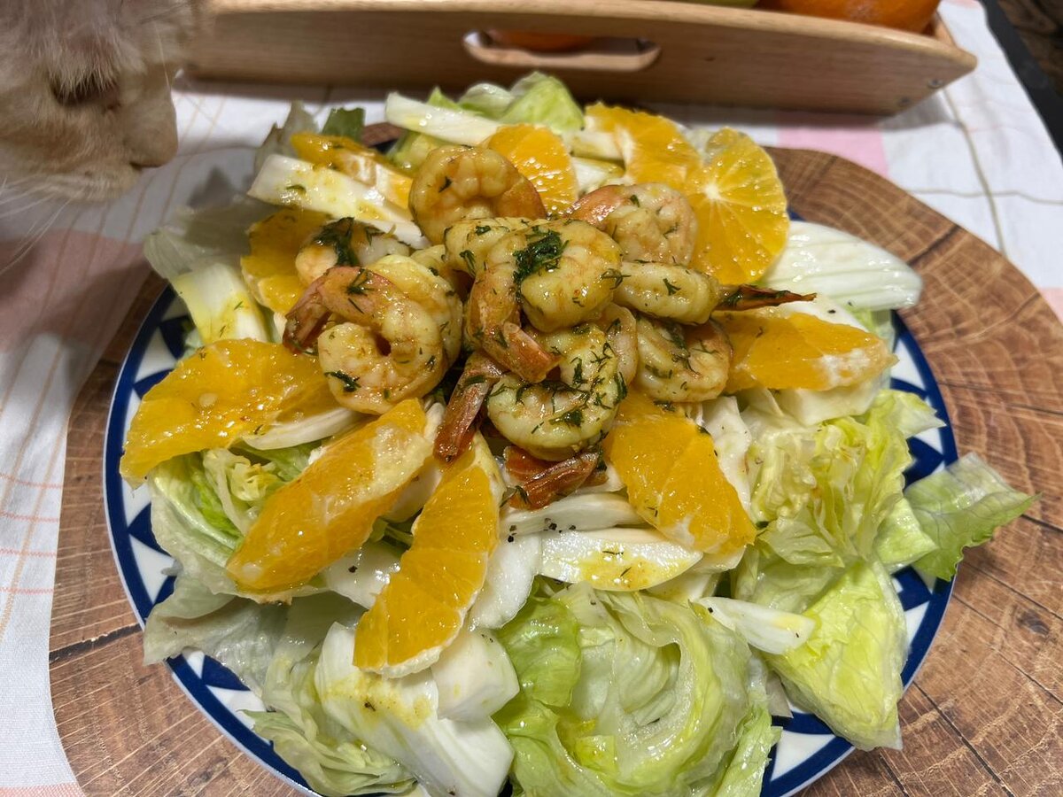 Расскажу вам сегодня по горячим следам об одном замечательном салате : с креветками, фенхелем и апельсинами. Он лёгкий в приготовлении, но освежающий и необычный. Таким салатом вы точно удивите своих близких. Расскажу сперва, как я готовлю креветки 🍤: В разогретое оливковое масло я добавляю зубчик чеснока и обжариваю до появления интенсивного аромата. Добавляю к нему размороженные креветки. Обжариваю буквально пару минут до изменения цвета. Следом добавляю: паста чеснок с имбирем. Соус Амба (пажитник, куркума, лимон, квашеное манго). Можно заменить карри и лимонным соком. Вливаю на глаз соевый соус. Добавляю свежую или сушеную зелень. Перемешиваю и отключаю огонь. Креветочки готовы 🤤 Далее собираем наш салат. Режем фенхель, маринуем с солью, перцем и лимонным соком. Режем салатные листья. Выкладываем слоями: листья, фенхель, апельсиновые ломтики, креветки. Поливаем оливковым маслом. Такая вот красотища у нас получилась. Мой младший сынок обожает всякие разные овощные са