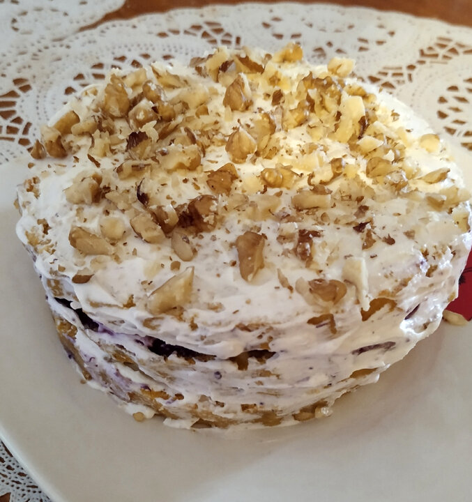 ✓ 50гр «разрешённой» муки (я брала овсяную). Перемешать, выложить в форму и на 6-7 минут в микроволновку. Остужаем, разрезаем на коржи. Крем из мягкого творога (200 г) и подсластителя. Я добавила ещё между слоями чернику в с/с и припущенное зеленое яблоко. В общем, фантазия -на ваш вкус. Обсыпать орешками, и через 15 минут можно есть. Приятного аппетита! От наших друзей: Евгений Додолев, журналист, писатель, на Радио Медиаметрикс Больше общения и рецептов - в группе "Рецепты для диабетиков" в ВКонтакте! Рецепт на странице Автор рецепта – Лариса Волкова