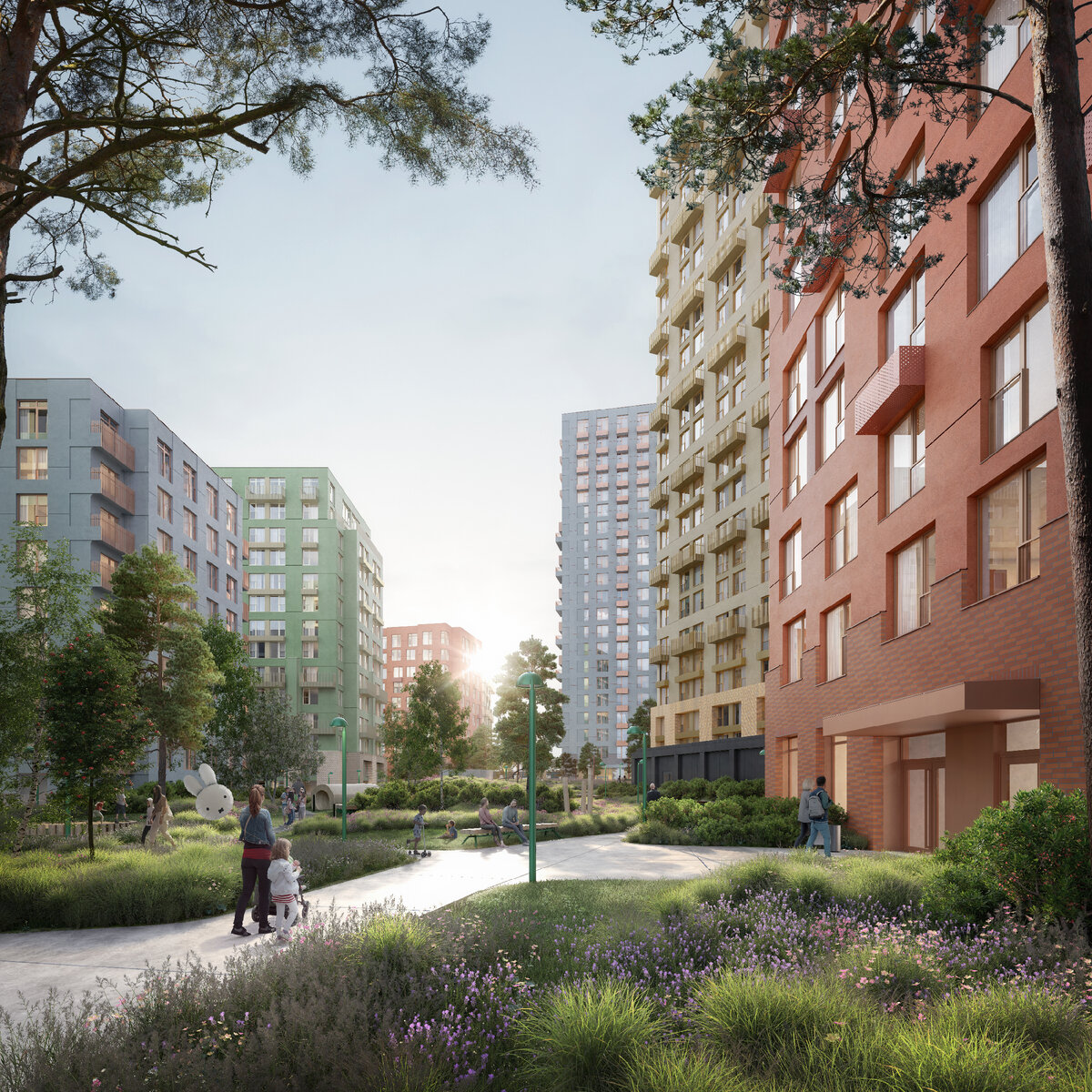 Центральными элементами комплекса станут высокие дома-башни, из окон которых откроются потрясающие виды на природу: лес и близлежащие озера. Квартиры будут наполнены солнечным светом и теплом, потому что по соседству отсутствует высотная застройка, которая могла бы их затенить. Архитекторы предусмотрели максимум панорамного остекления, поэтому здания легко интегрируются в окружающую среду и смотрятся естественно. Высотные башни расположены непрямым рядом, что улучшает инсоляцию всех квартир. Они соединены одноэтажными общественными корпусами. Дома пониже спрятаны вглубь квартала – в более приватную и тихую зону.