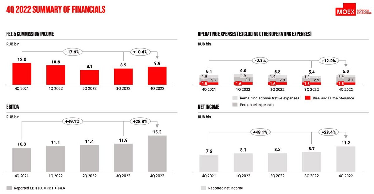 Забытая многими инвесторами идея в акциях Московской биржи умудрилась с локальных минимумов октября 2022 года прибавить более 60%, после чего уйти в коррекцию. Обычно бизнес компании воспринимают с точки зрения фондового рынка, однако основной доход приносят прочие доходы. Сегодня акцентируем на них внимание и разберем отчет по МСФО за 2022 год. 👉Итак, комиссионные доходы компании за отчетный период упали на 9,8% до 37,5 млрд рублей. Основной вклад в сокращение доходов внесли Фондовый и Срочный рынки. Падение составило в объемах 41,3% и 50,9% соответственно, что и немудрено на фоне блокировки в прошлом году нерезидентов. Денежный рынок и доходы от ИТ-услуг выправили ситуацию. 🔺Операционные расходы компании напротив, выросли на 16,2% до 23,8 млрд рублей. Основной прирост пришелся на амортизацию нематериальных активов и расходы на рекламу. Несмотря на это, компания увеличила чистую прибыль на 29,2% до 36,3 млрд рублей. За счет чего этого удалось достичь, ведь комиссионные доходы сокра