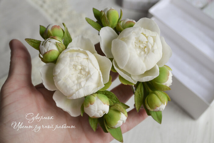Материал - самоотвердевающая флористическая глина. Тонировка пастелью закреплена матовым лаком - спреем. Время изготовления одной заколки минимум 3 дня. Самое сложное - сделать цветы очень лёгкими, легче чем живые. Вес одной заколки получился всего 27 грамм. Внутри каждого цветка и бутона - пенопластовые шарики. А в тайскую глину добавлено максимальное количество лёгкой зефирной японской. И ещё сложность - к белой глине во время работы прилипают пылинки, ворсинки, которые приходится аккуратно выковыривать. Перед лепкой обязательно делаю влажную уборку дома и по сто раз мою руки) Сначала леплю цветы, бутоны, жду когда они полностью высохнут и потом приклеиваю к ним чашелистики, листья. Ну а потом - тонировка. В конце собираю все элементы на тейп-ленту очень плотно, (не на глину чтоб не утяжелять изделие) Все стыки разглаживаю стеком, покрываю лаком. Две веточки по бокам приматываю к основе тоже тейп-лентой, а между ними вклеиваю на глину центральный цветок. Сырая глина намертво приклеив