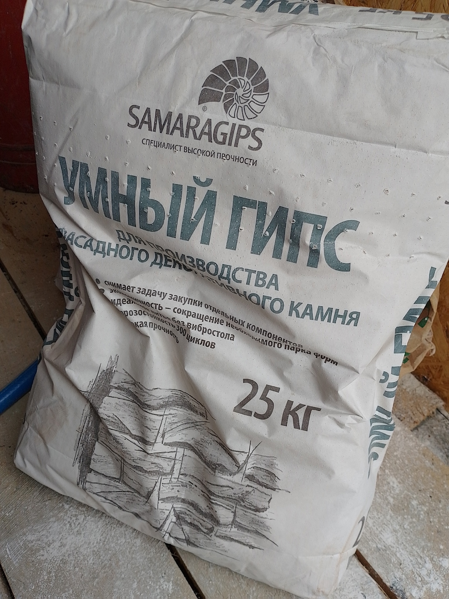 А вот Умный гипс для производства декоративного фасадного камня. Он не белый, т.к. в составе есть цемент. В большинстве случаев я подкрашиваю или полностью окрашиваю изделия, а еще цвет гипса можно менять с помощью специальных добавок. Так что цвет - не проблема. При замешивании нужно меньше воды. Время застывания дольше.