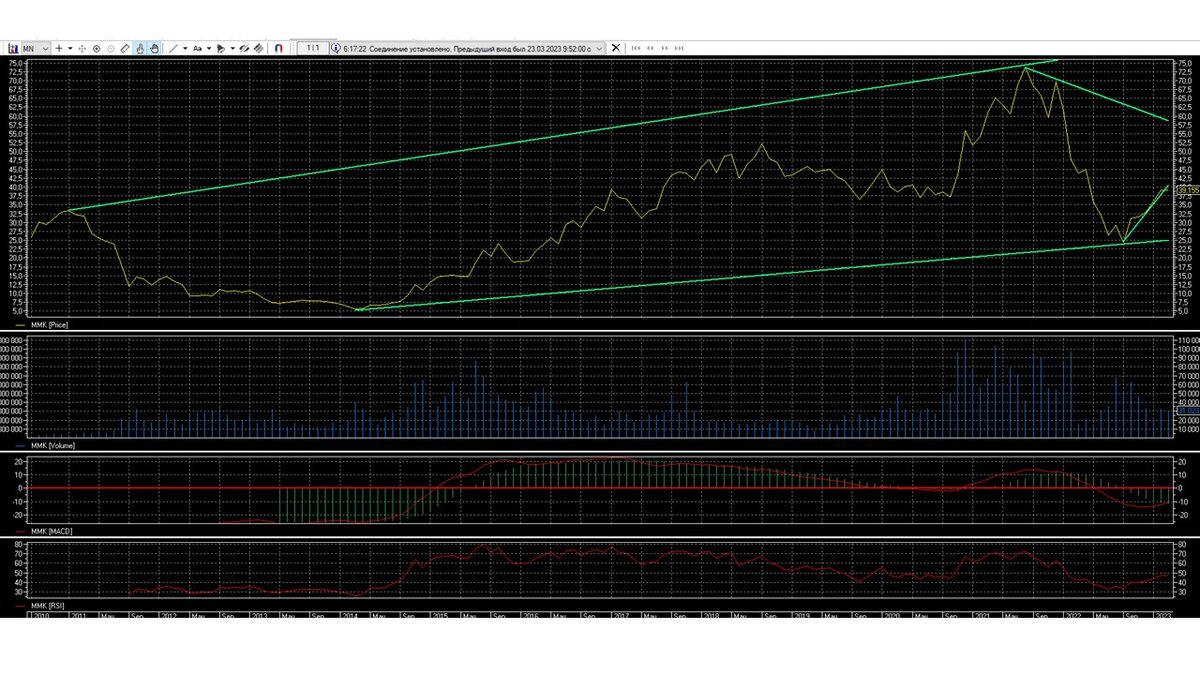 По дивидендной политике компания ММК ничего не изменила, дивиденды пока не планируют платить. Поэтому среди стратегических инвесторов акция ММК в 2023 году не будет пользоваться большим интересом. Если брать на длительный срок, это до 5 лет, тогда акция ММК будет интересна, потому что акция ММК на месячном графике практически по индикаторам на дне. Значит пора переходить на технический анализ определить движения акции ММК до середины апреля.