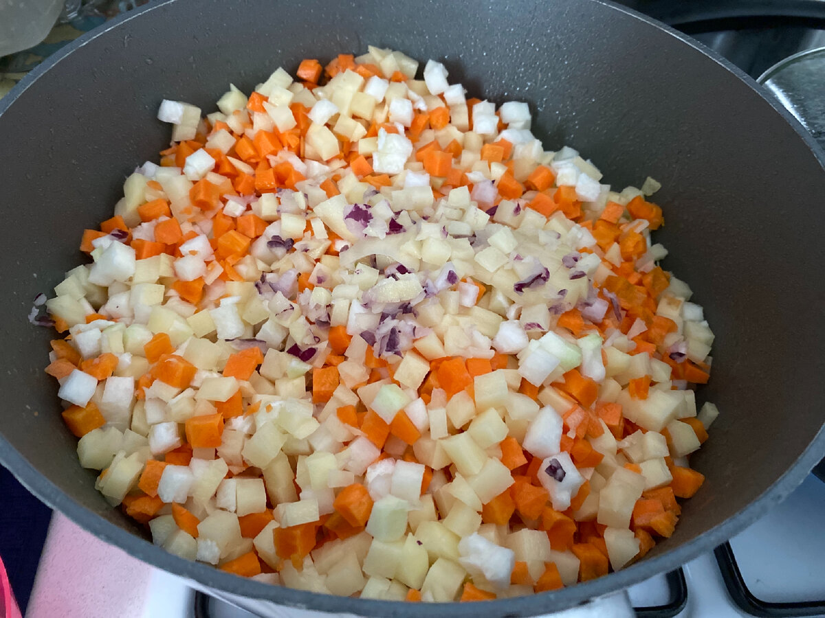 Мангольд я нежно люблю и часто готовлю. Обычно я добавляю его в щи, борщ, зелёный борщ с яйцом; делаю омлет, тушу курицу с ним… Сегодня же я приготовила что-то новенькое - овощной супчик из мангольда с разными видами овощей. Получилось очень вкусно 🤤, поэтому я со спокойной душой посоветую его и вам, тем более, дать рецепт супа с мангольдом просила в комментариях одна из моих подписчиц. Обжариваем на оливковом масле кусочки курицы (у меня было филе грудки). Забыла сфотографировать этот этап, поэтому сразу перехожу к следующему: нарезать кубиками лук, морковь, репу (турнепс), капусту кольраби, помидор, картофель. Добавить овощи к грудке и потушить несколько минут, чтобы они чуть зарумянились. Тем временем промоем листья мангольда (свекольной ботвы) как следует. Заливаем воду в кастрюлю из кипящего чайника. У меня на такую кастрюлю поместились 2. Режем соломкой ботву. Добавляем ее в наш суп. Заправляем его специями: соль, пара столовых ложек порошка куриного супа, чуть курку