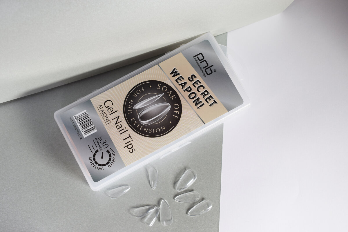 Вы еще не наращиваете на гелевые типсы? Узнайте о них больше, чтобы работать быстрее и экономить средства на материалы! Клиентки останутся довольны — ногти получаются изящными, максимально похожими на естественные, гибкими и прочными в носке. Что такое гелевые типсы? Мастера с опытом помнят пластиковые типсы для наращивания ногтей. Они крепились на натуральный ноготь с помощью клея сильной фиксации, который повреждал ногтевые пластины, но все равно не гарантировал прочность сцепки. Наращенные ногти часто трескались и ломались. Хорошо, что существуют современные технологии в нейл-индустрии! Гелевые типсы для наращивания Secret Weapon PNB — продукт нового поколения. Как гелевые типсы ускоряют наращивание? Для наращивания на верхние или нижние формы мастеру нужны навыки и время на установку форм, выкладку гелевого материала и выстраивание архитектуры ногтя. Гелевые типсы — это уже готовая архитектура. В ассортименте PNB 2 популярные формы — миндаль и балерина. Гелевые типсы заменяют и фор
